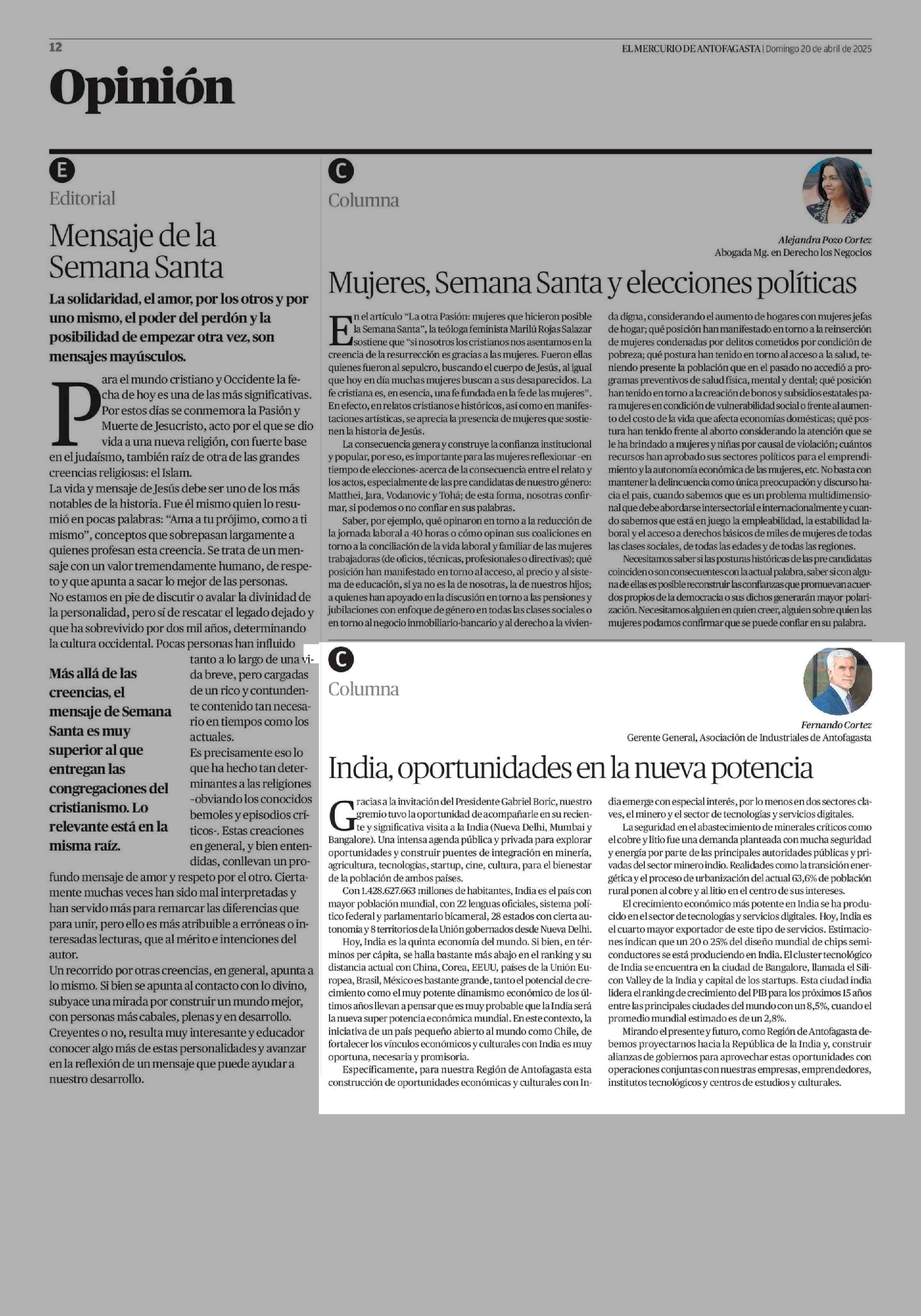 COLUMNAS DE OPINIÓN: India, oportunidades en la nueva potencia 20-04-2025 El Mercurio de Antofagasta |