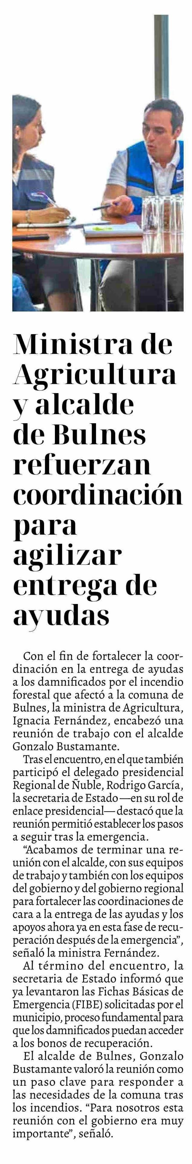 Título: Ministra de Agricultura y alcalde de Bulnes refuerzan coordinación para agilizar entrega de ayudas