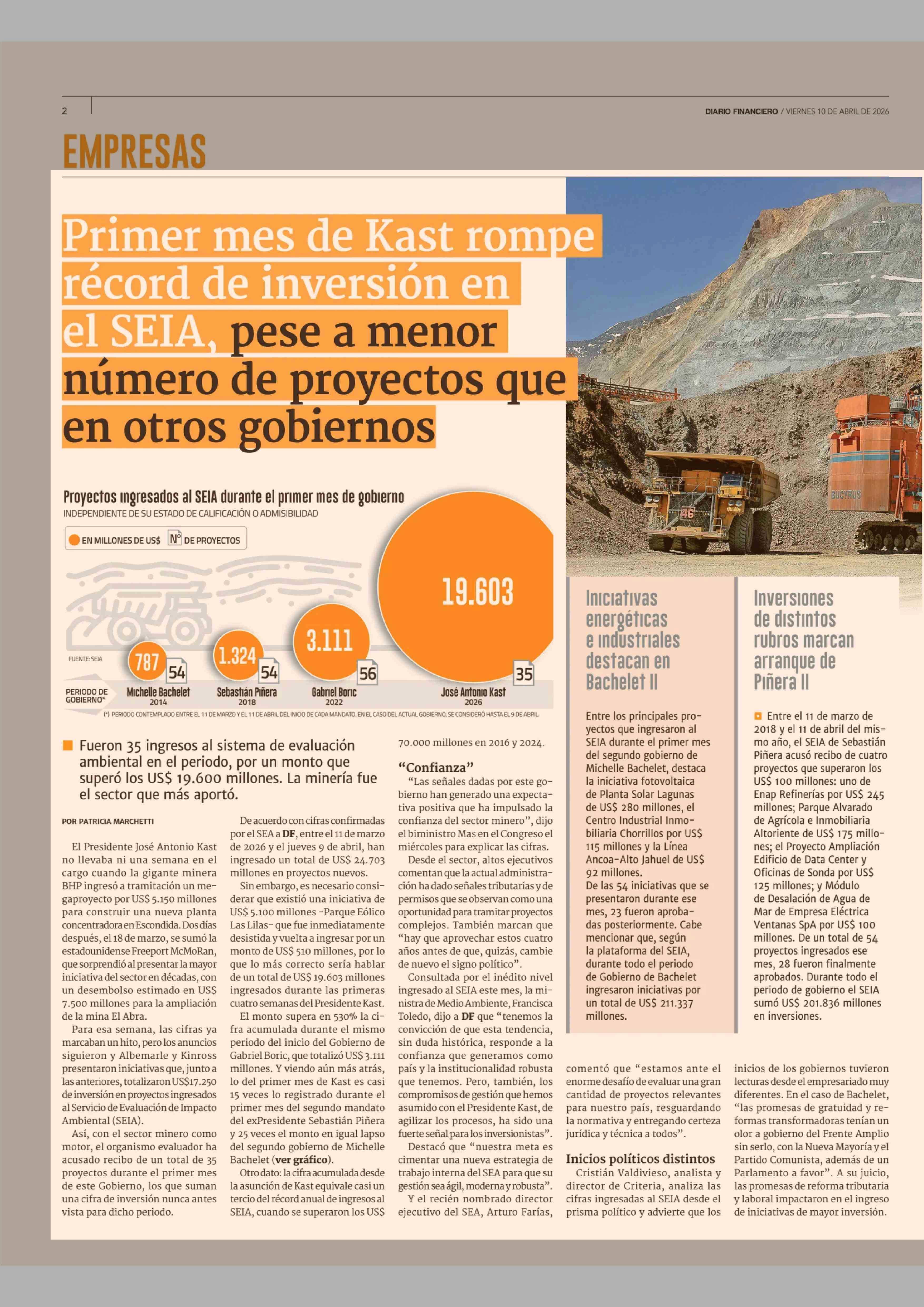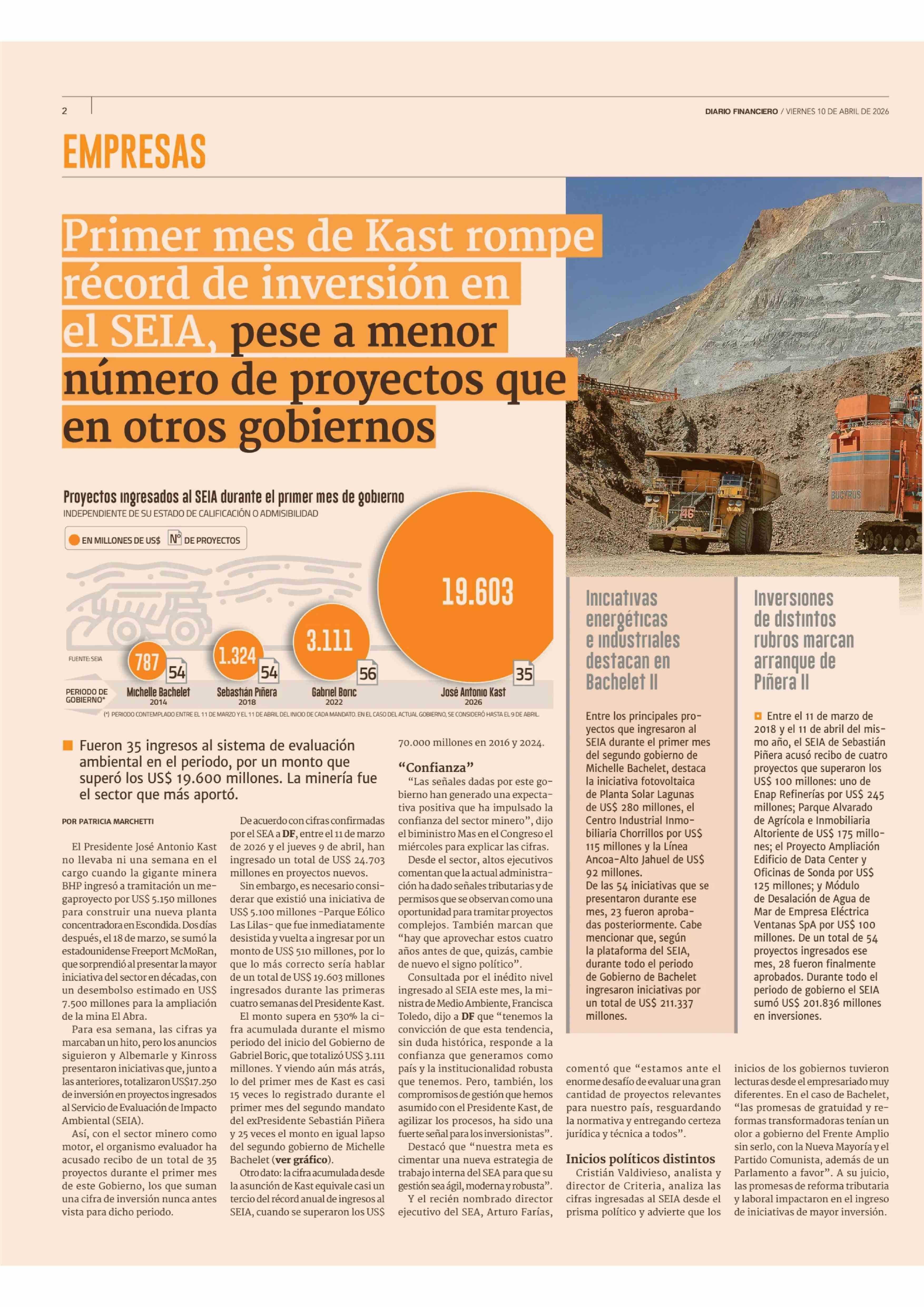 Primer mes de Kast rompe récord de inversión en el SEIA, pese a menor número de proyectos que en otros gobiernos 10-04-2026 Diario Financiero |