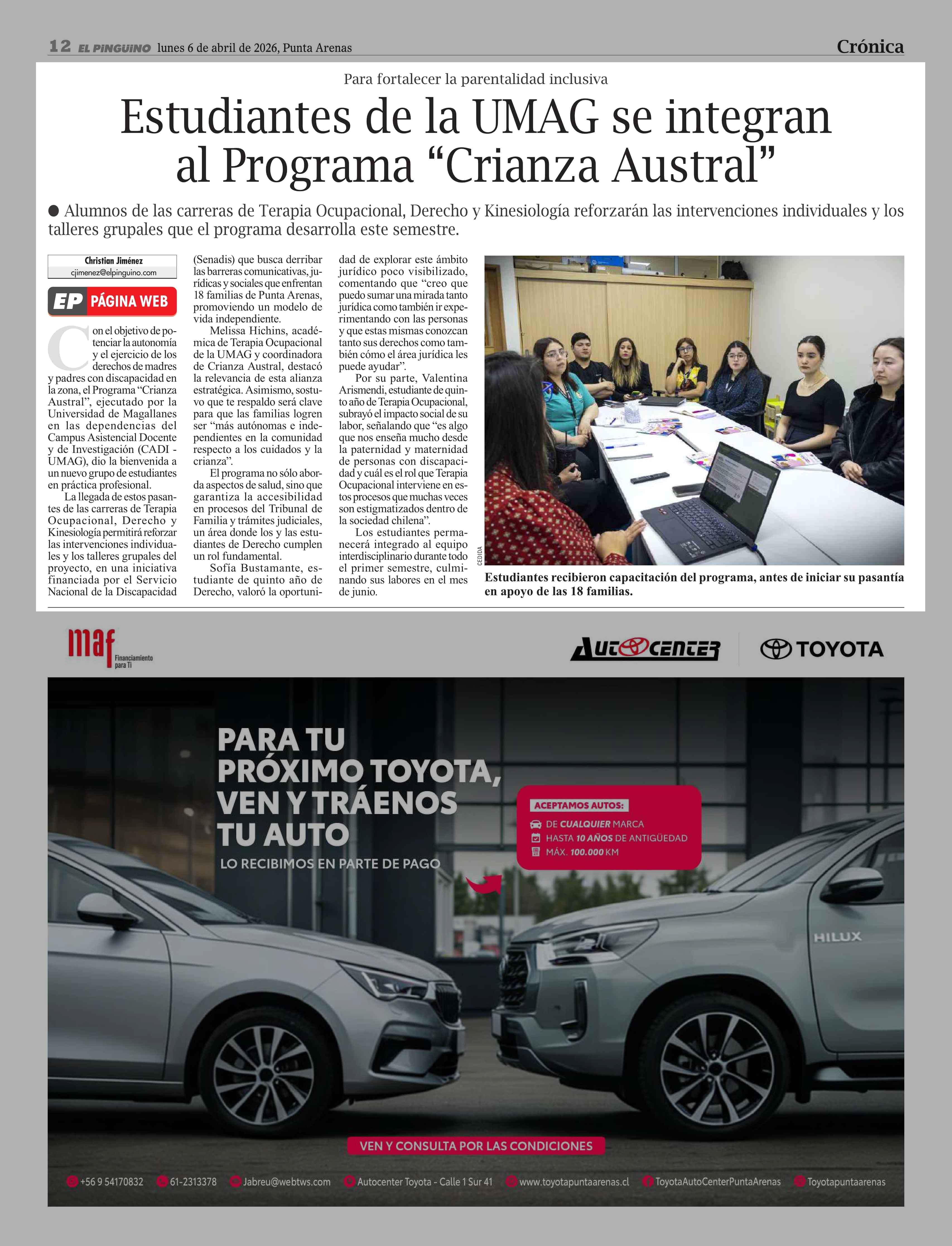 Estudiantes de la UMAG se integran al Programa “Crianza Austral” 06-04-2026 El Pingüino |