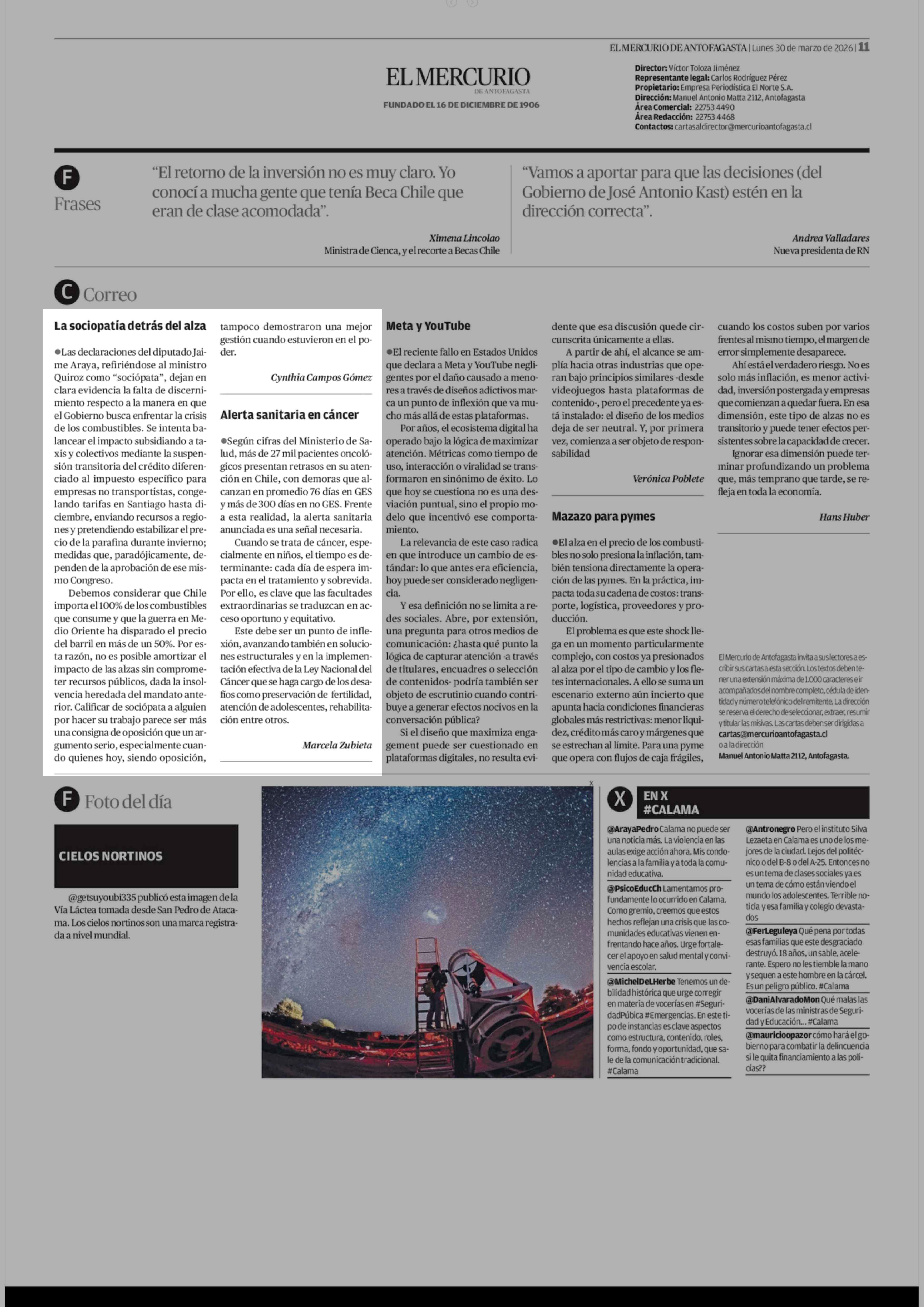 Cartas: La sociopatía detrás del alza 30-03-2026 El Mercurio de Antofagasta |