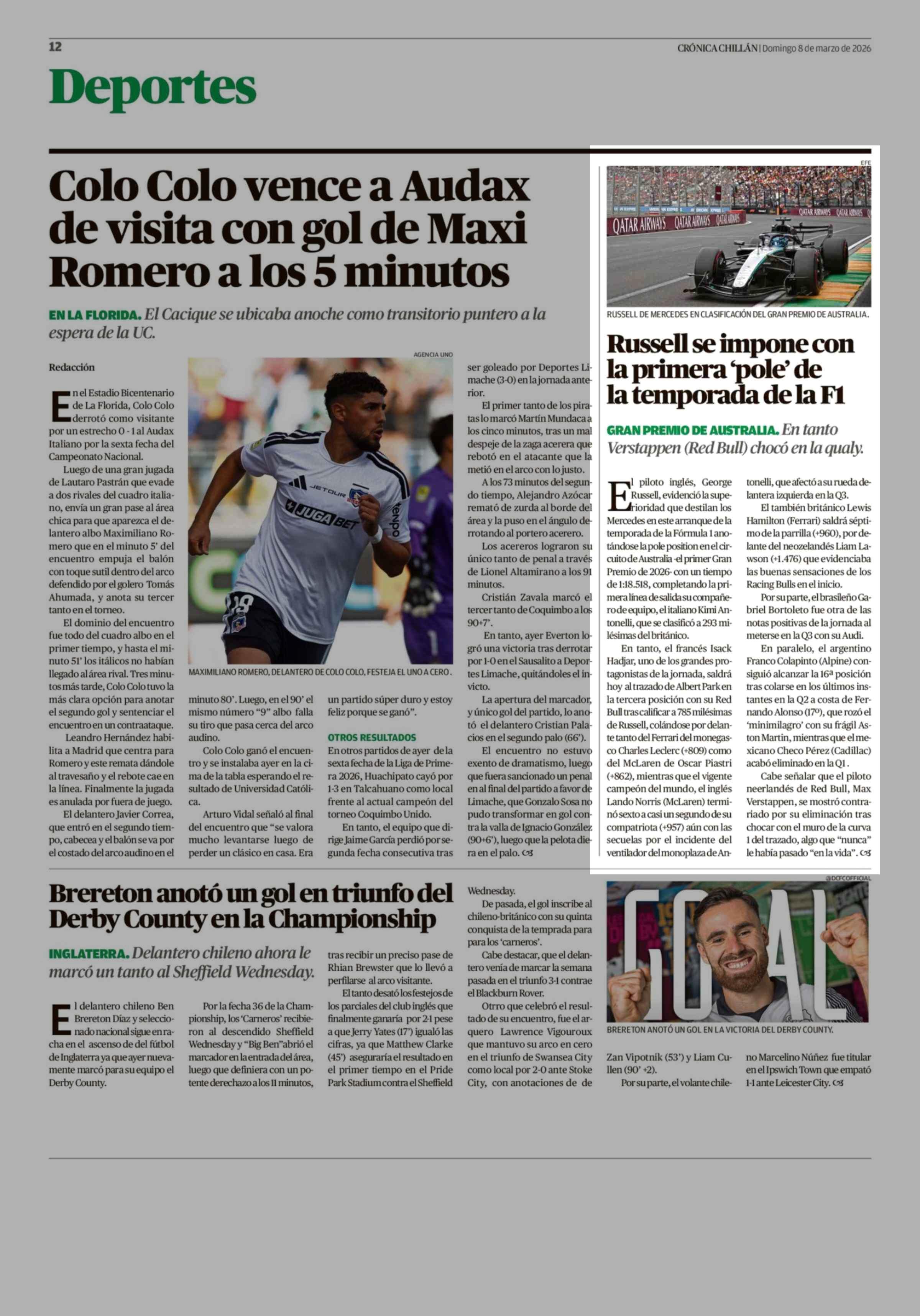 Russell se impone con la primera 'pole' de la temporada de la F1 08-03-2026 Crónica de Chillán |