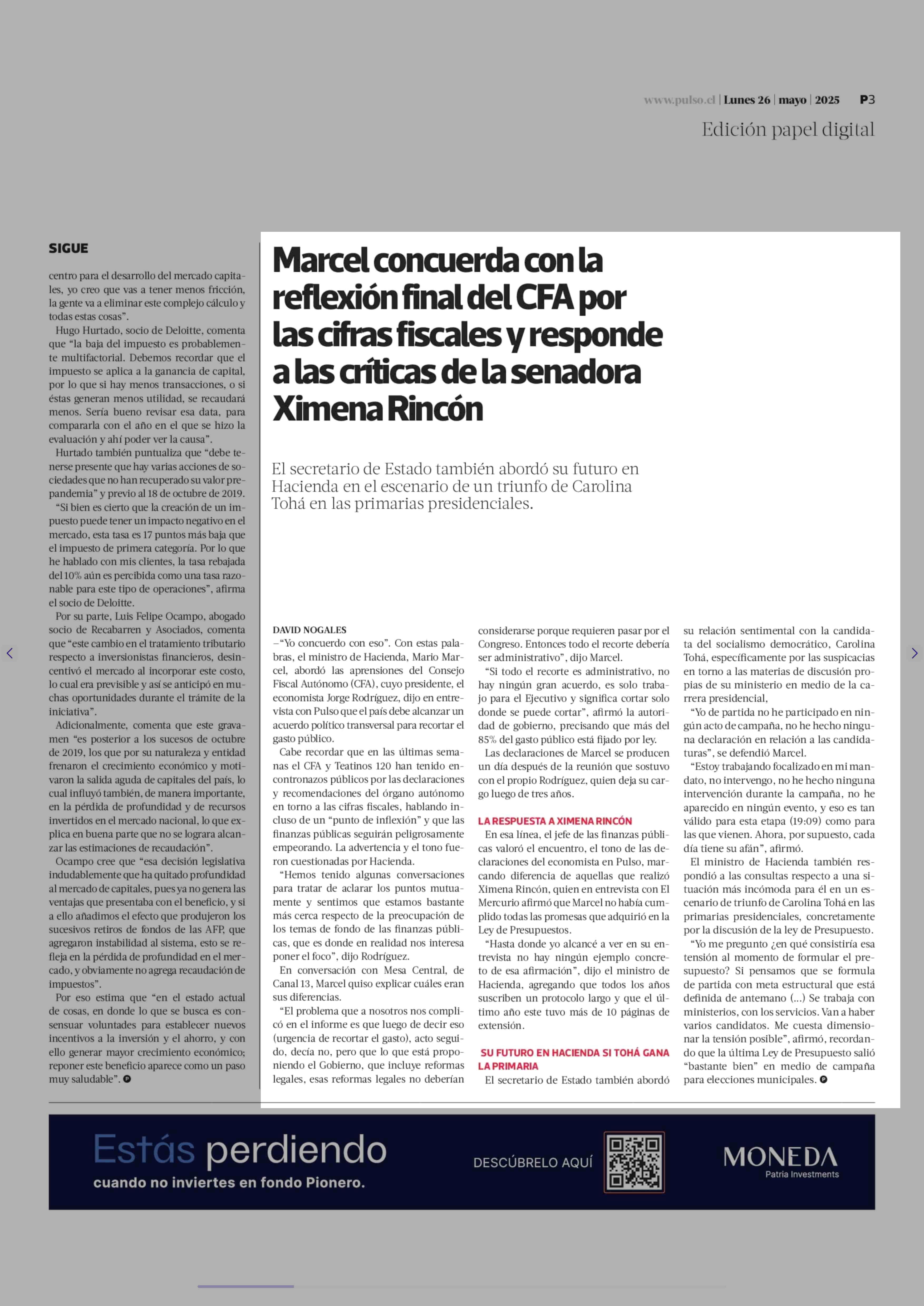 Marcel concuerda con la reflexión final del CFA por las cifras fiscales y responde alas críticas de la senadora Ximena Rincón 26-05-2025 La Tercera |