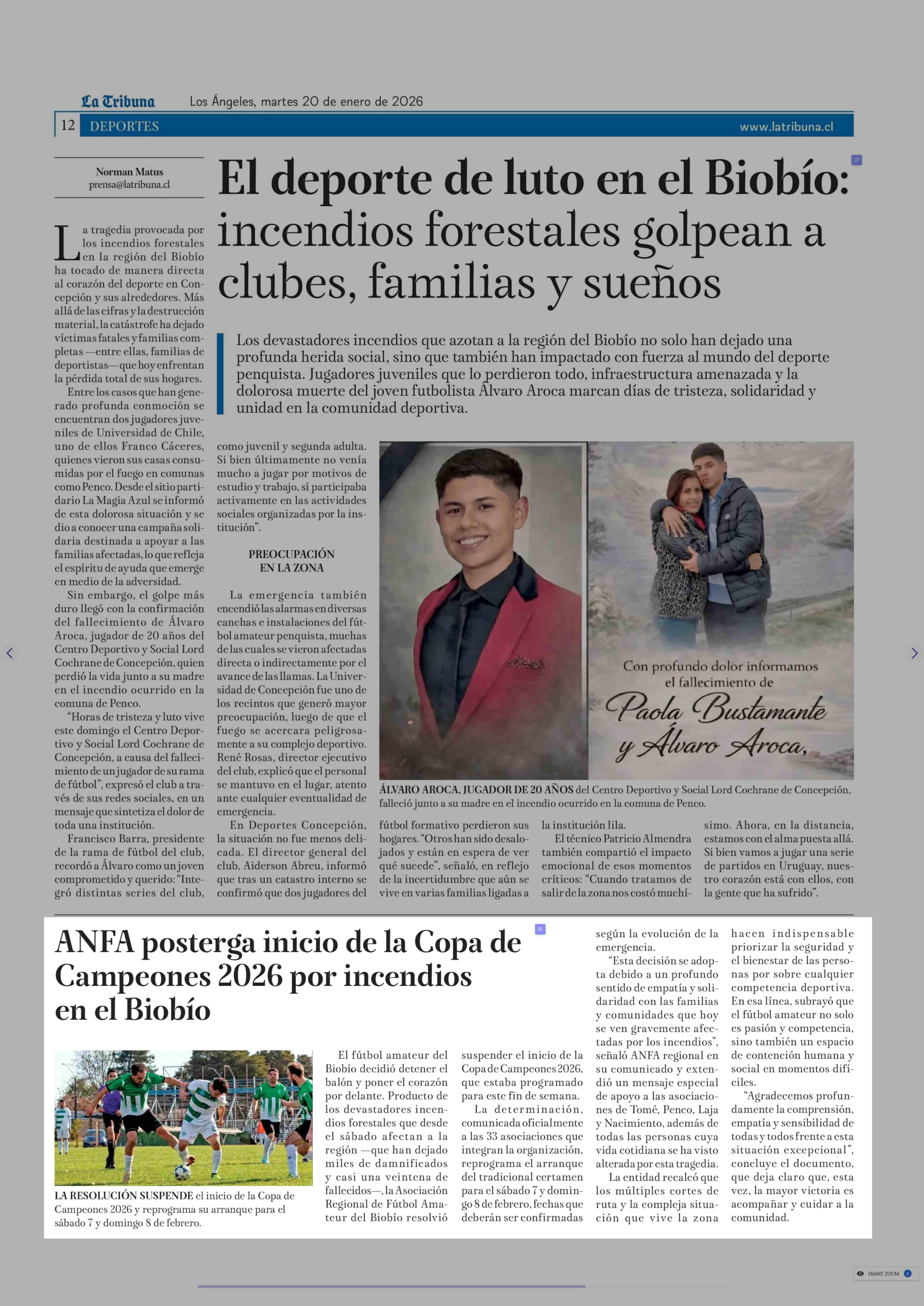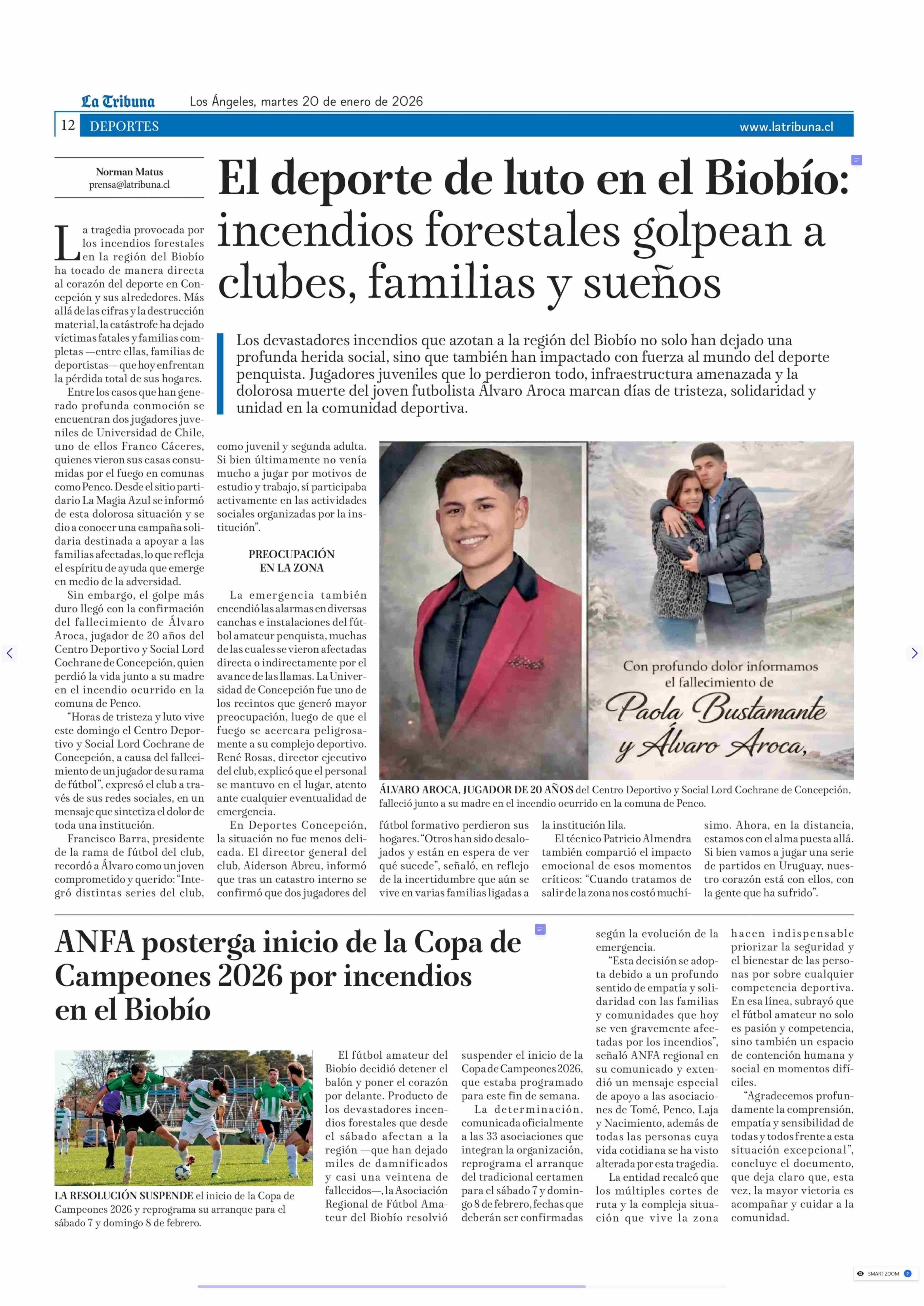 ANFA posterga inicio de la Copa de Campeones 2026 por incendios en el Biobío 20-01-2026 La Tribuna |