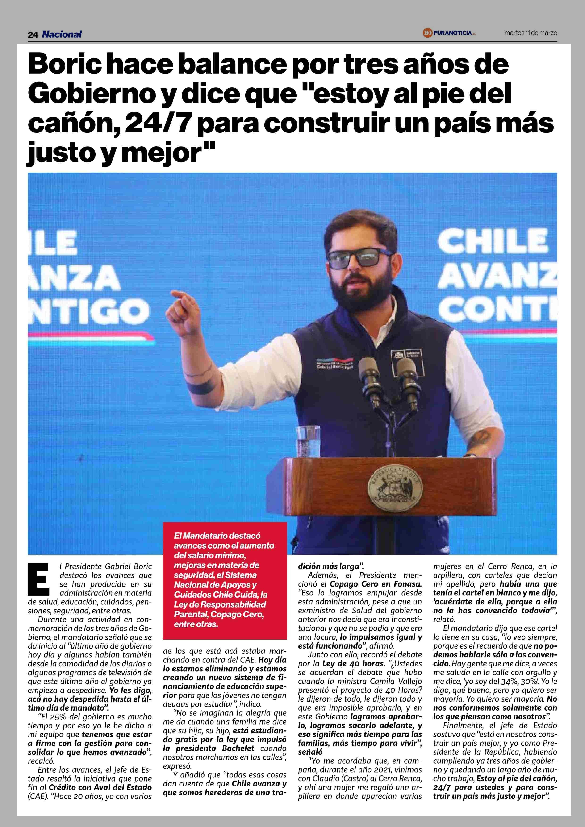 Boric hace balance por tres años de Gobierno y dice que "estoy al pie del cañón, 24/7 para construir un país más justo y mejor” 11-03-2025 Puranoticia.cl |