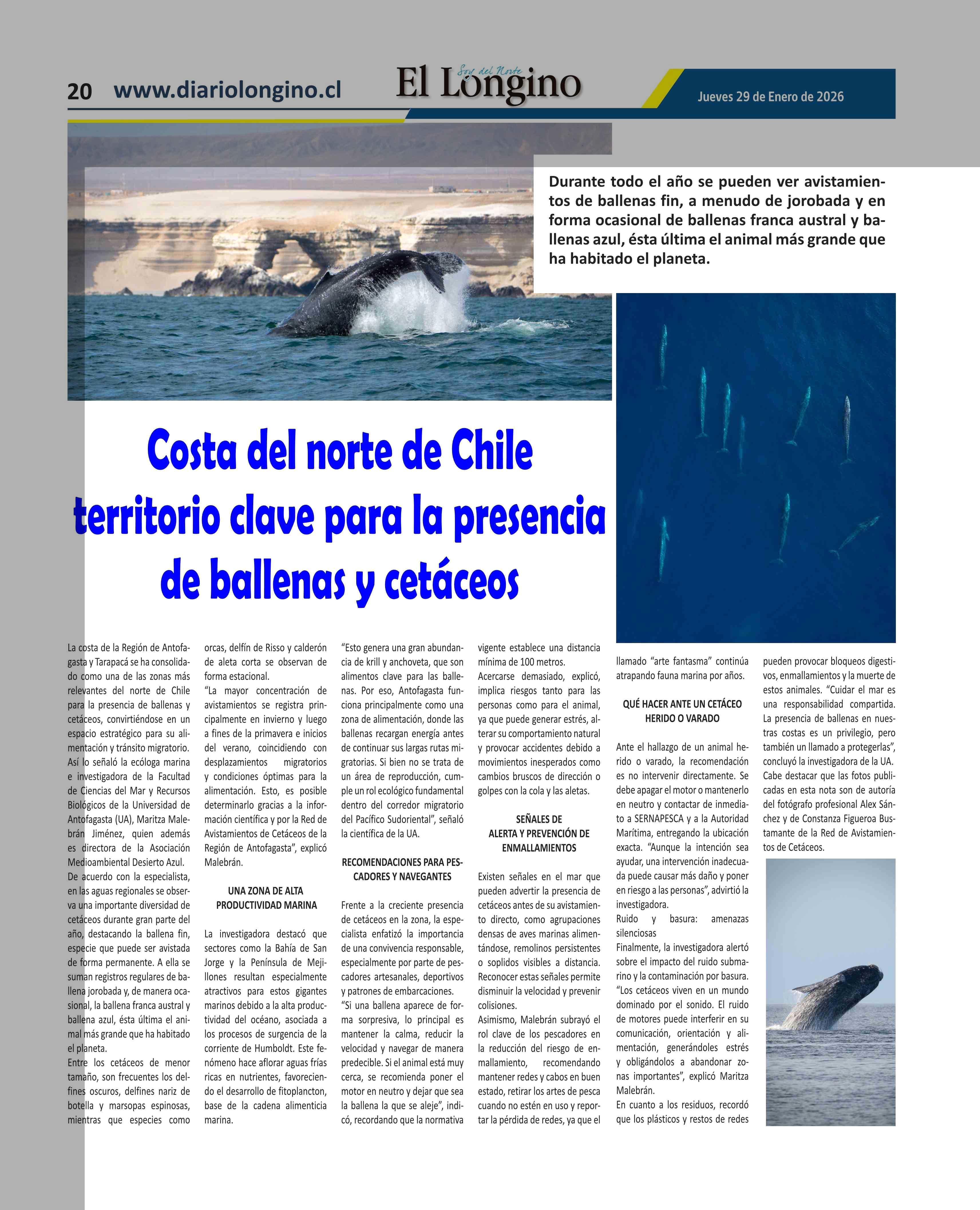 Costa del norte de Chile territorio clave para la presencia de ballenas y cetáceos 29-01-2026 El Longino |