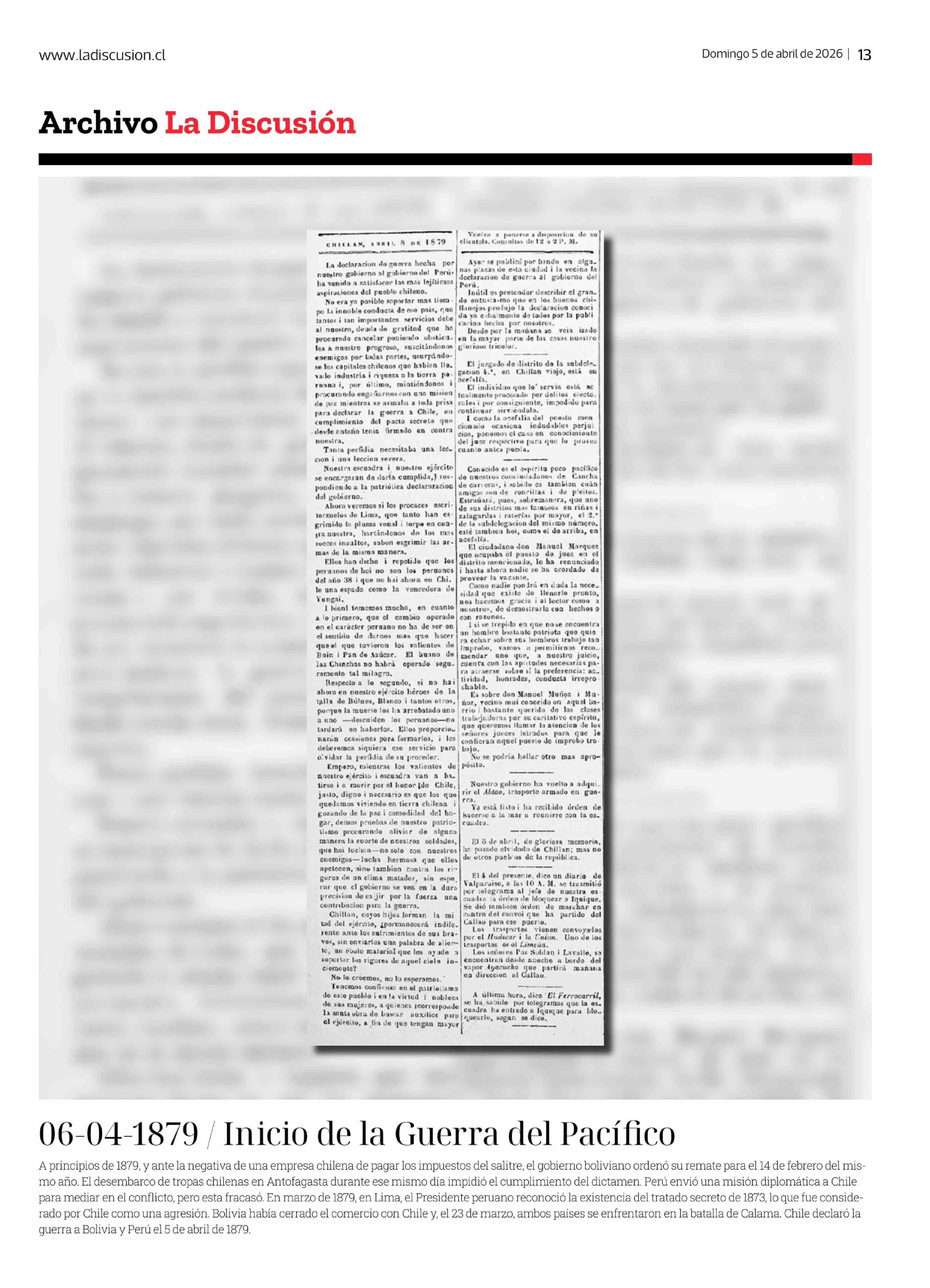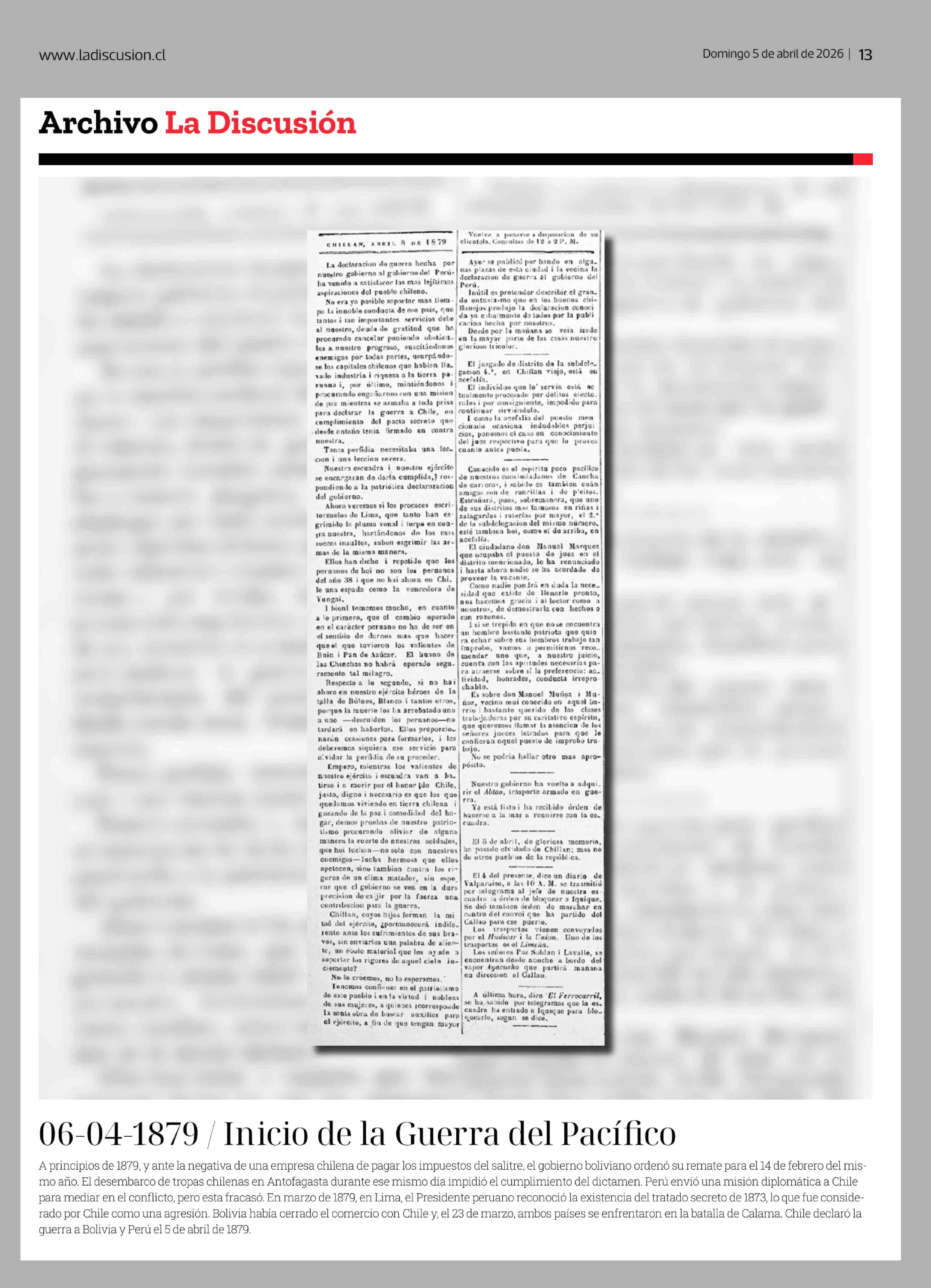 06-04-1879 / Inicio de la Guerra del Pacífico 05-04-2026 La Discusión |