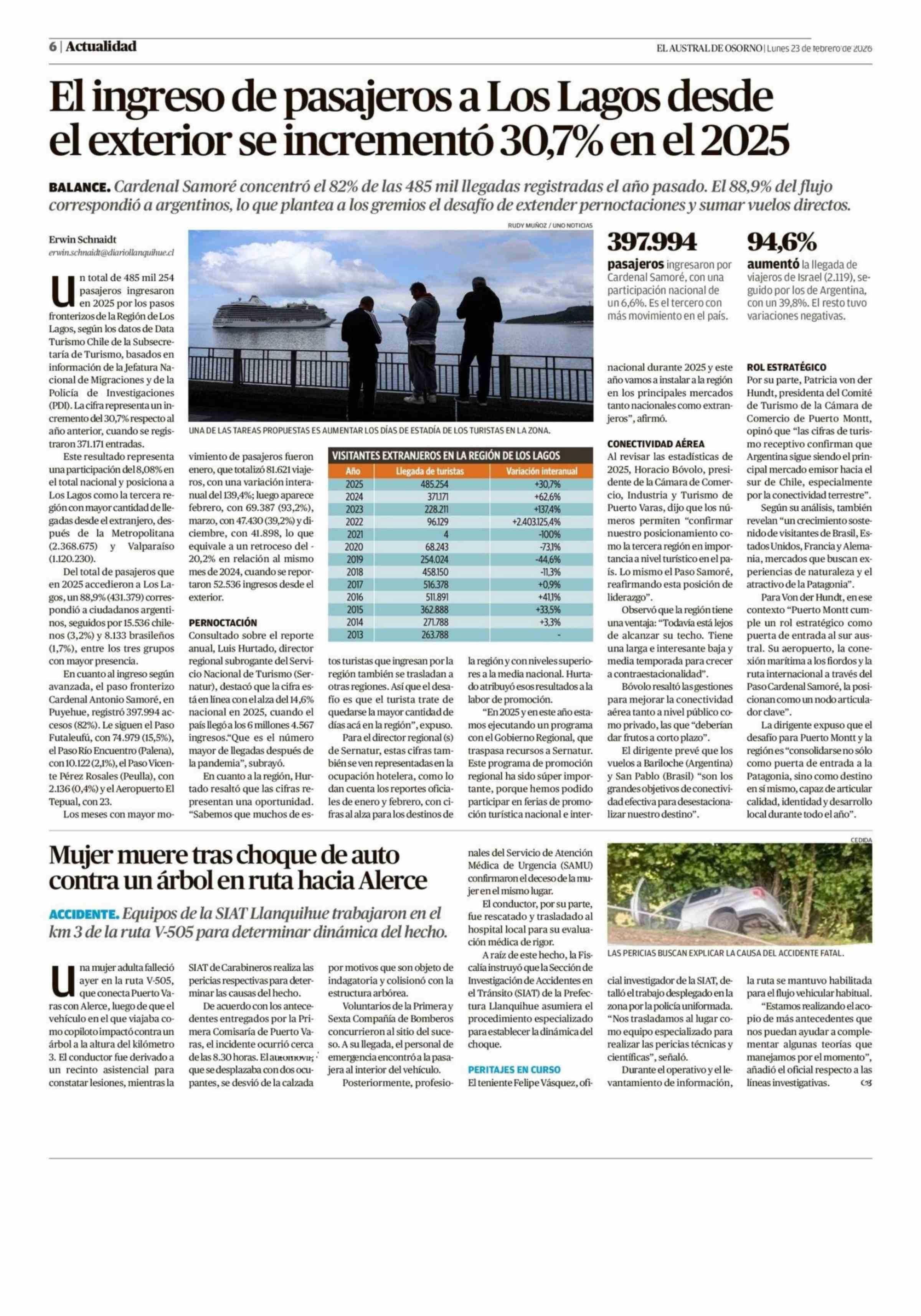 El ingreso de pasajeros a Los Lagos desde el exterior se incrementó 30,7% en el 2025 23-02-2026 El Austral de Osorno |