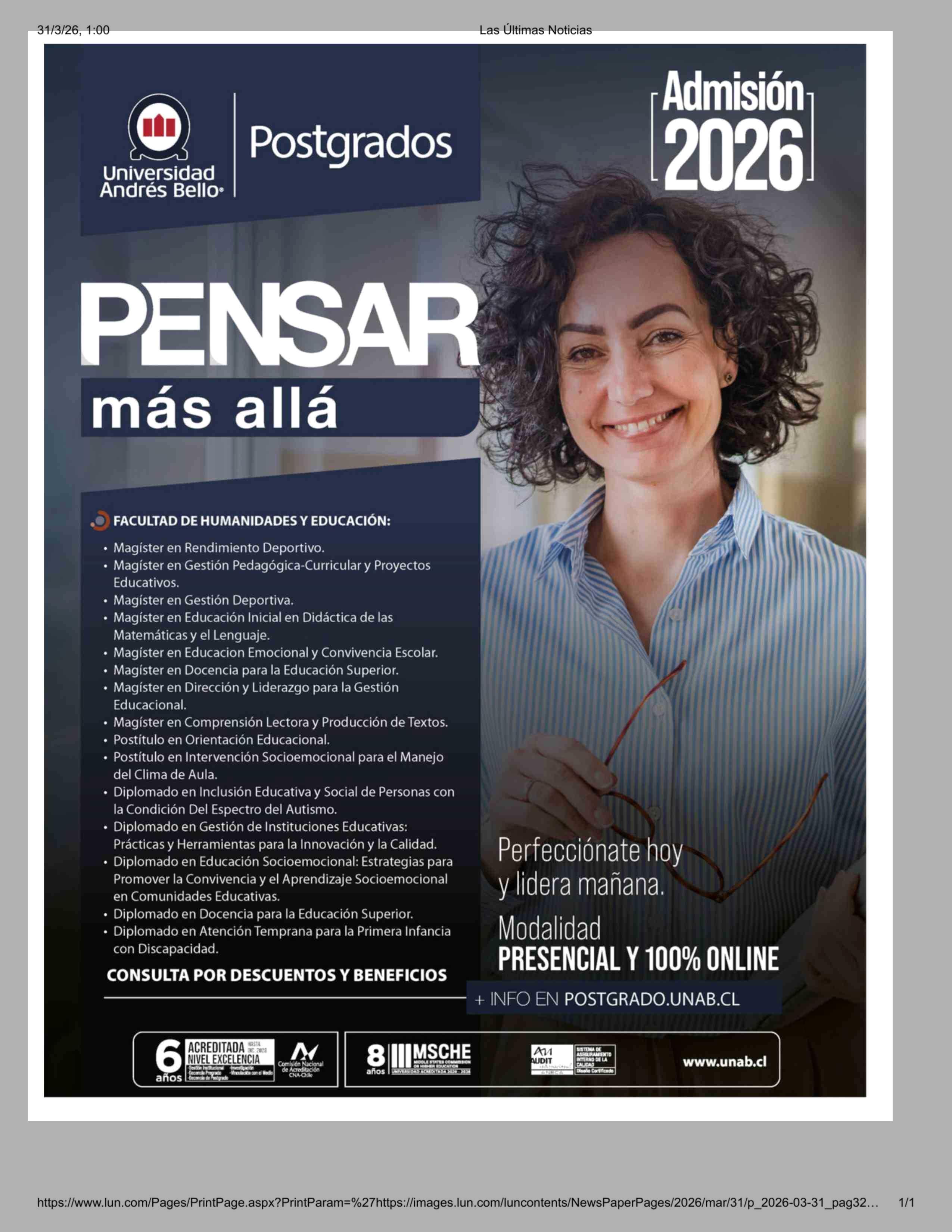 Aviso Universidad: Universidad Andrés Bello® 31-03-2026 Las Últimas Noticias |