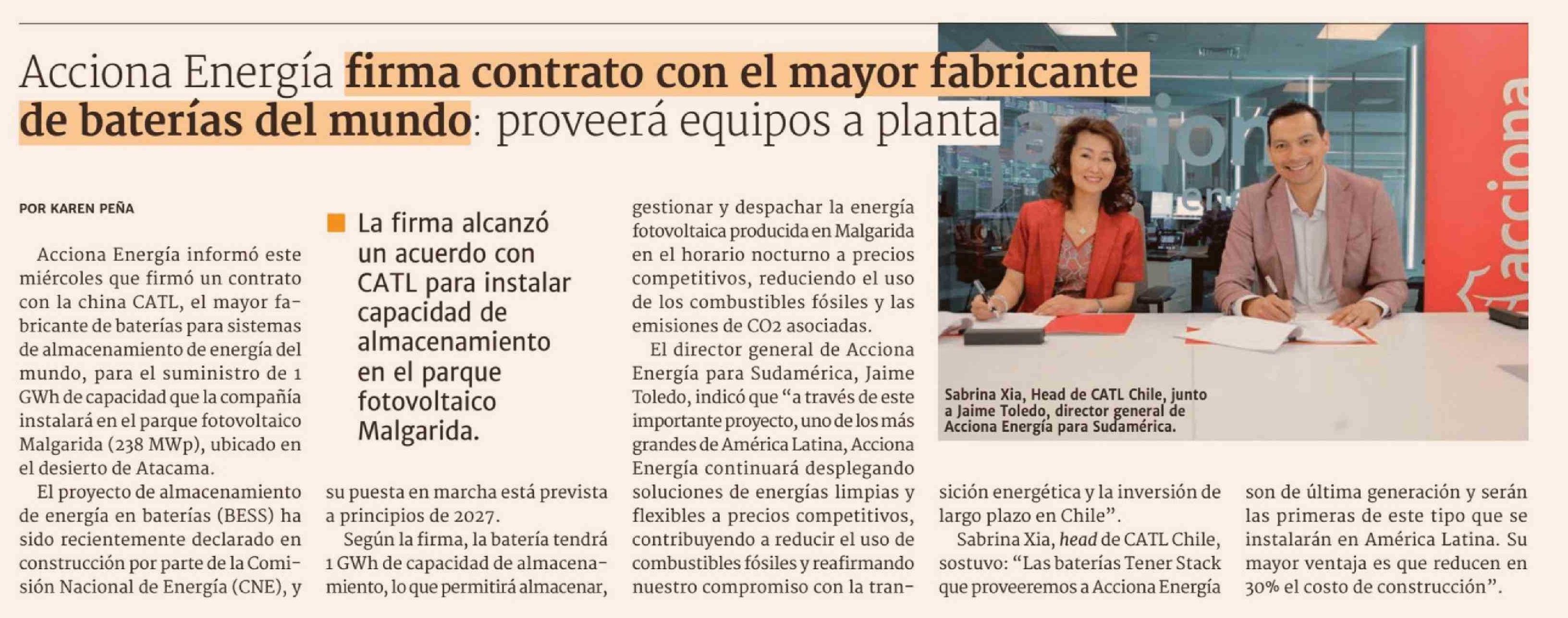Título: Acciona Energía firma contrato con el mayor fabricante de baterías del mundo: proveerá equipos a planta