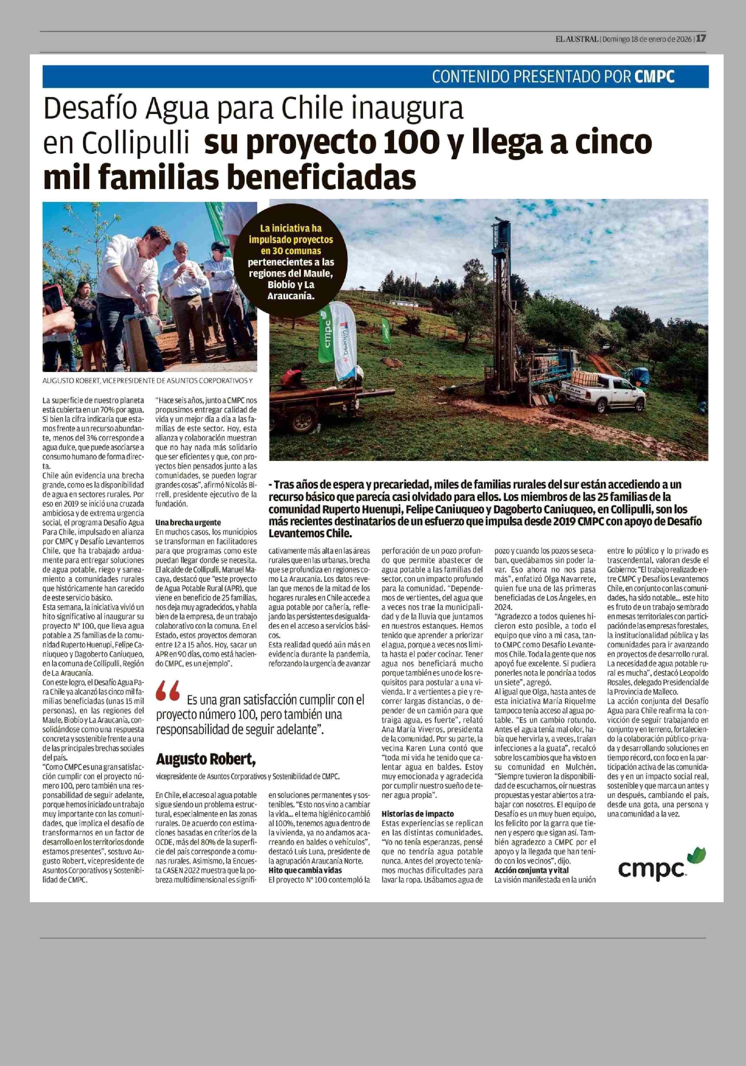 Título: Desafío Agua para Chile inaugura en Collipulli su proyecto 100 y llega a cinco mil familias beneficiadas