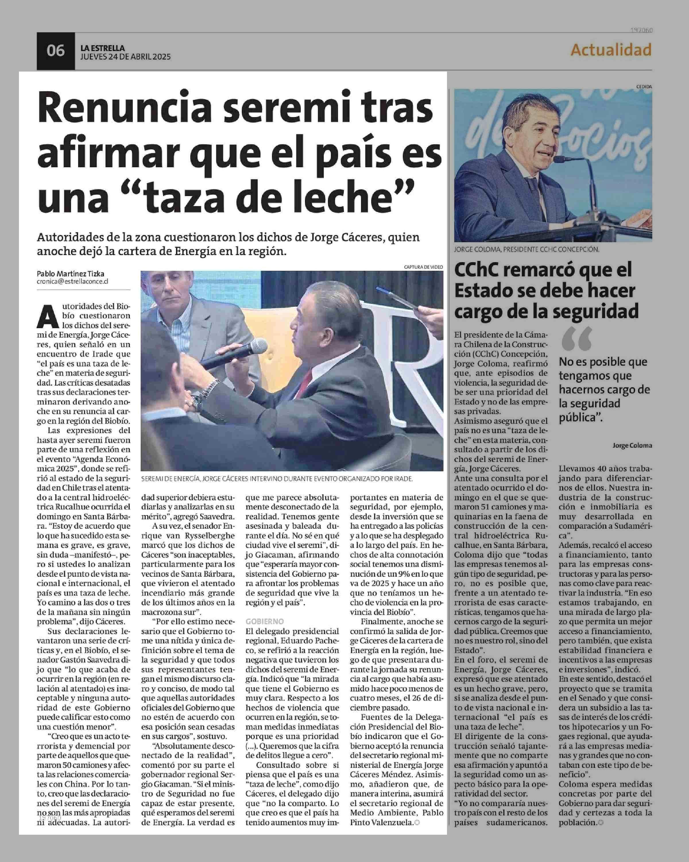 Renuncia seremi tras afirmar que el país es una “taza de leche” 24-04-2025 La Estrella de Concepción |