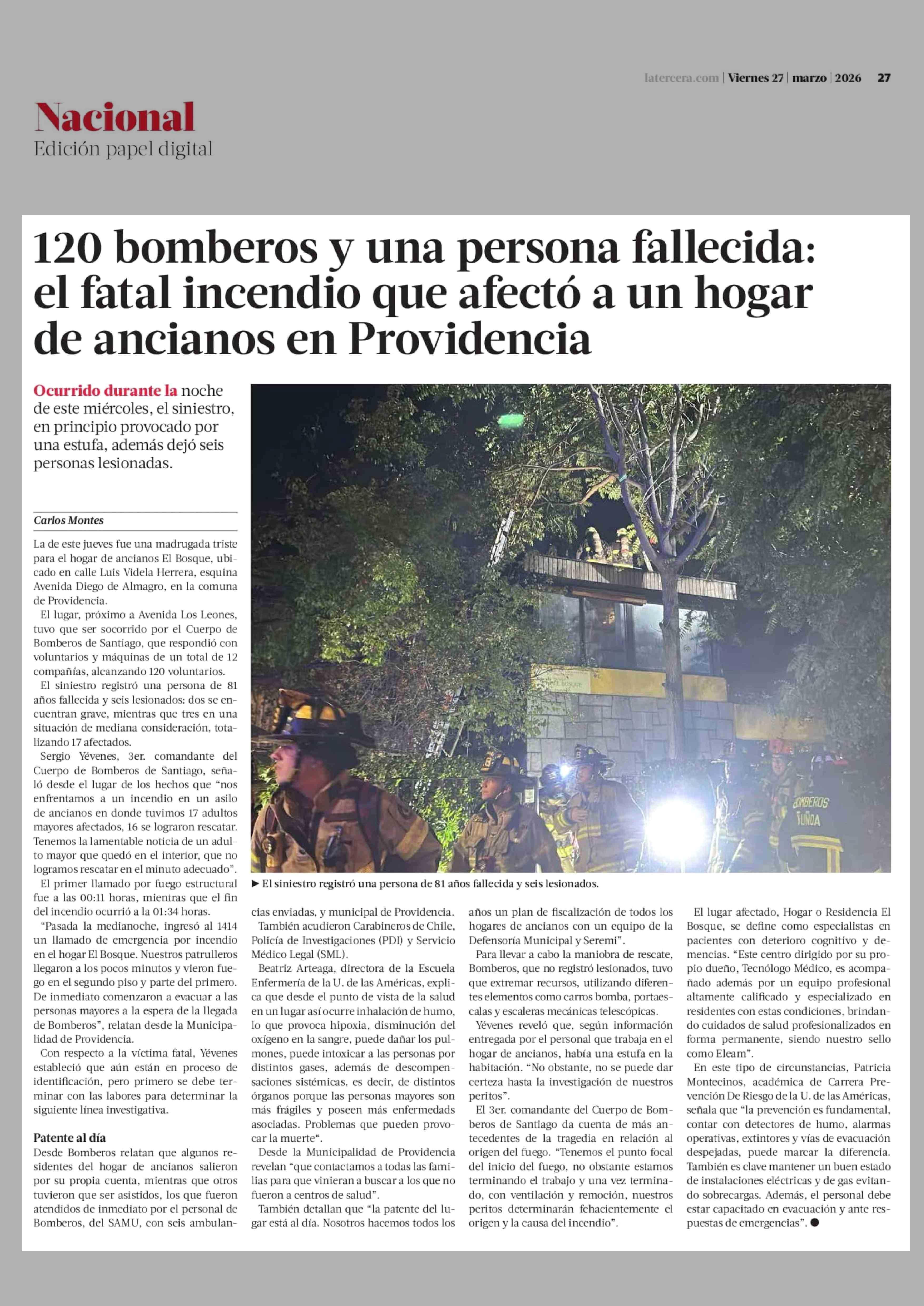 Título: 120 Bomberos y una persona fallecida: el fatal incendio que afectó a un hogar de ancianos en Providencia