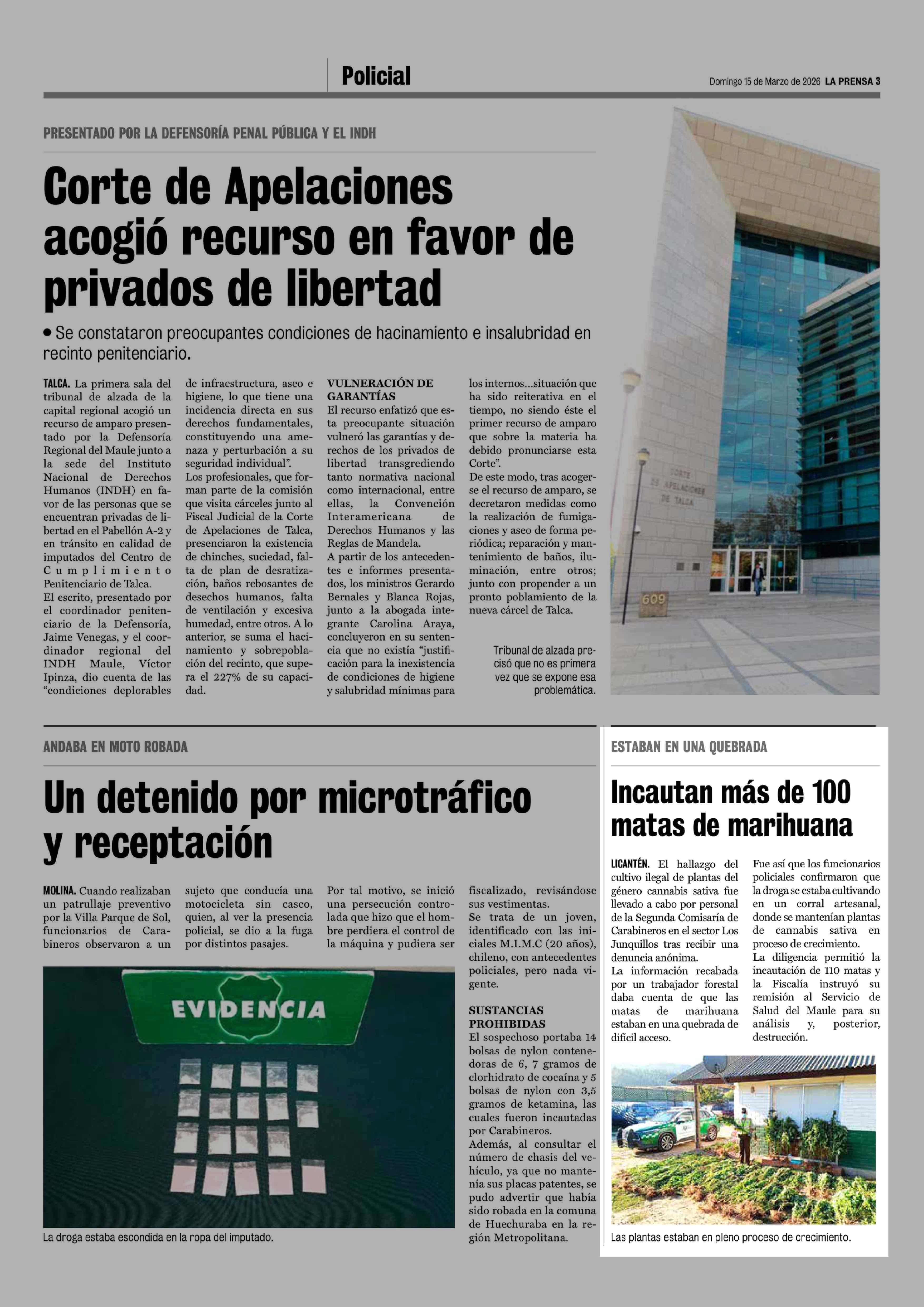 Incautan más de 100 matas de marihuana 15-03-2026 La Prensa de Curicó |
