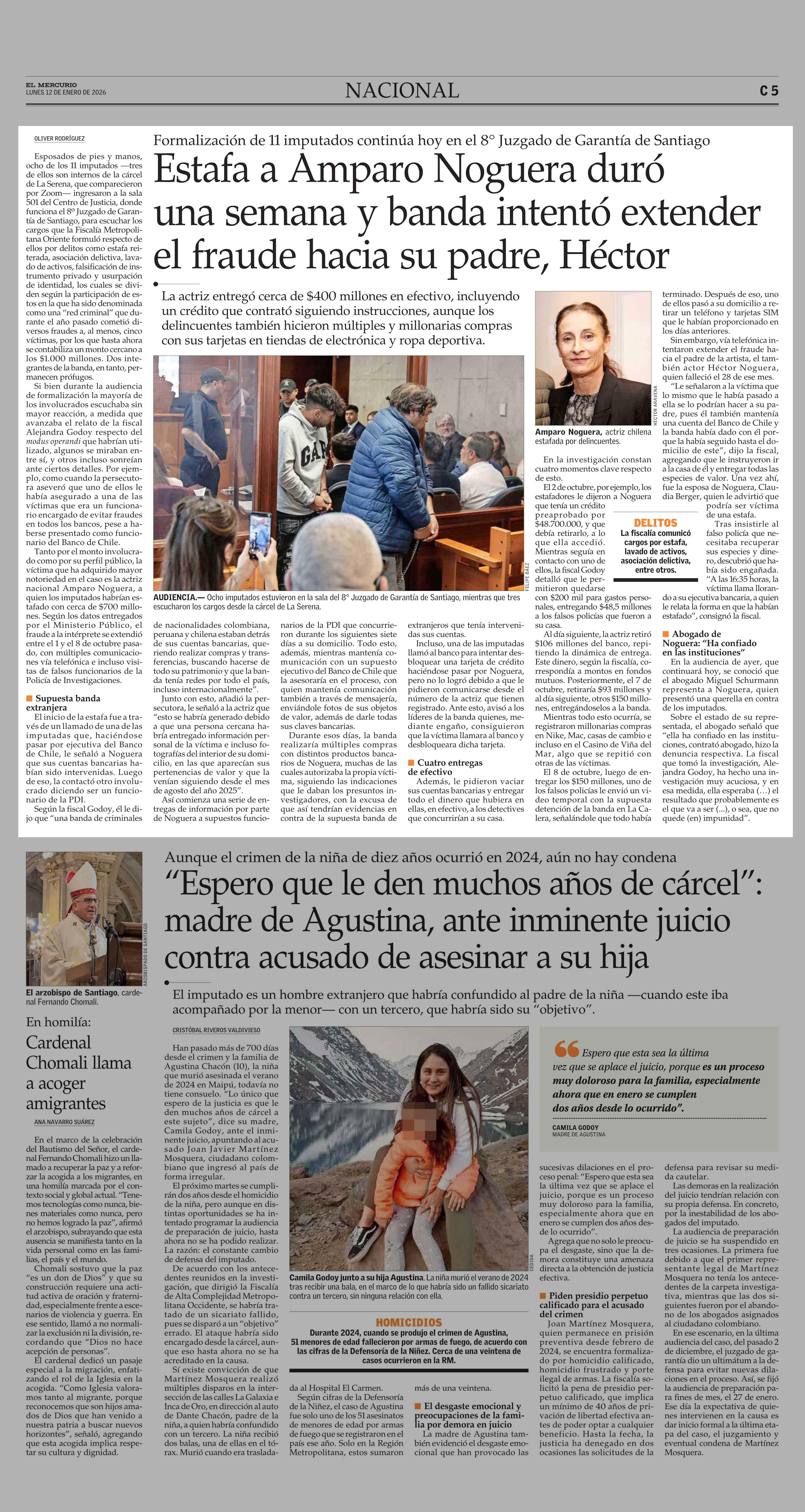 Estafa a Amparo Noguera duró una semana y banda intentó extender el fraude hacia su padre, Héctor 12-01-2026 El Mercurio |