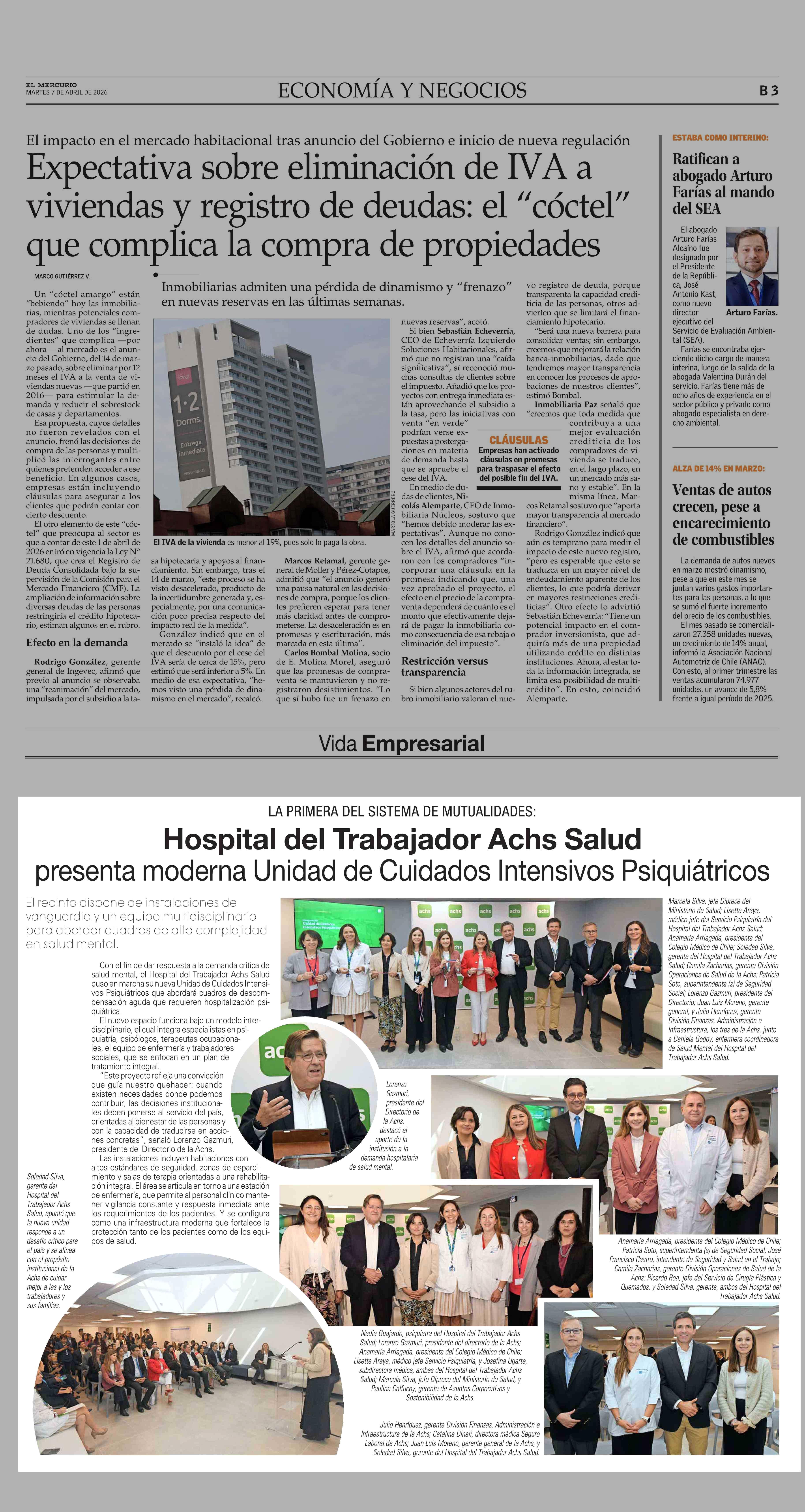 Hospital del Trabajador Achs Salud presenta moderna Unidad de Cuidados Intensivos Psiquiátricos 07-04-2026 El Mercurio |
