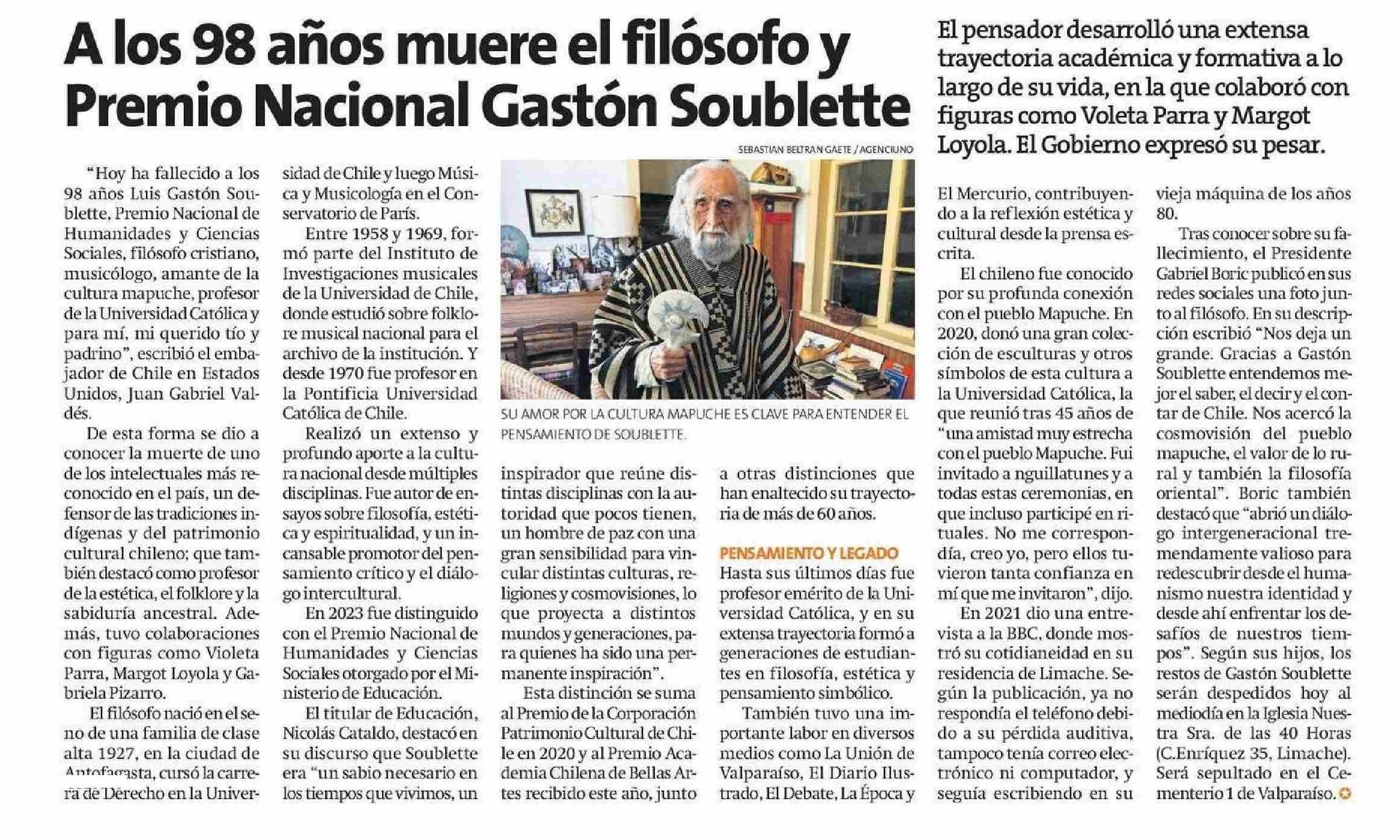 A los 98 años muere el filósofo y Premio Nacional Gastón Soublette 26-05-2025 La Estrella de Antofagasta |