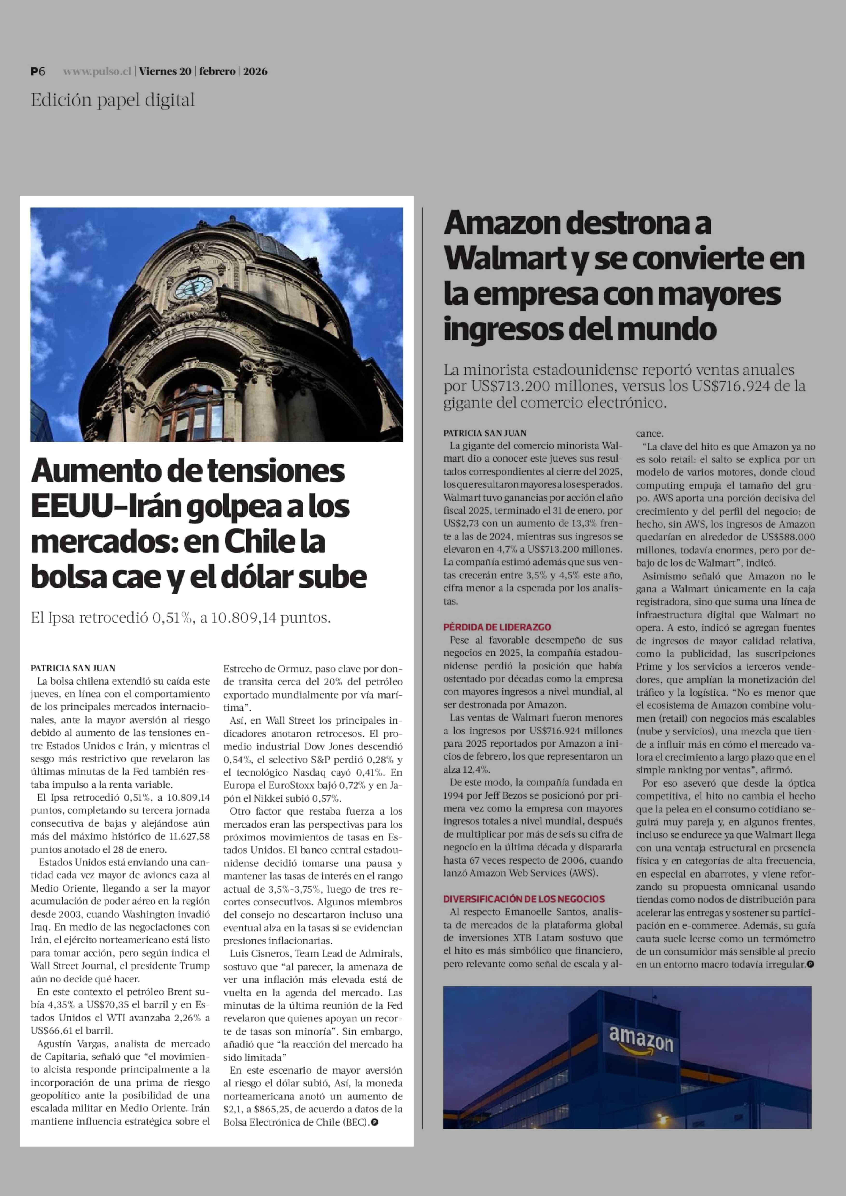 Aumento de tensiones EEUU-Irán golpea a los mercados: en Chile la bolsa cae y el dólar sube 20-02-2026 La Tercera |