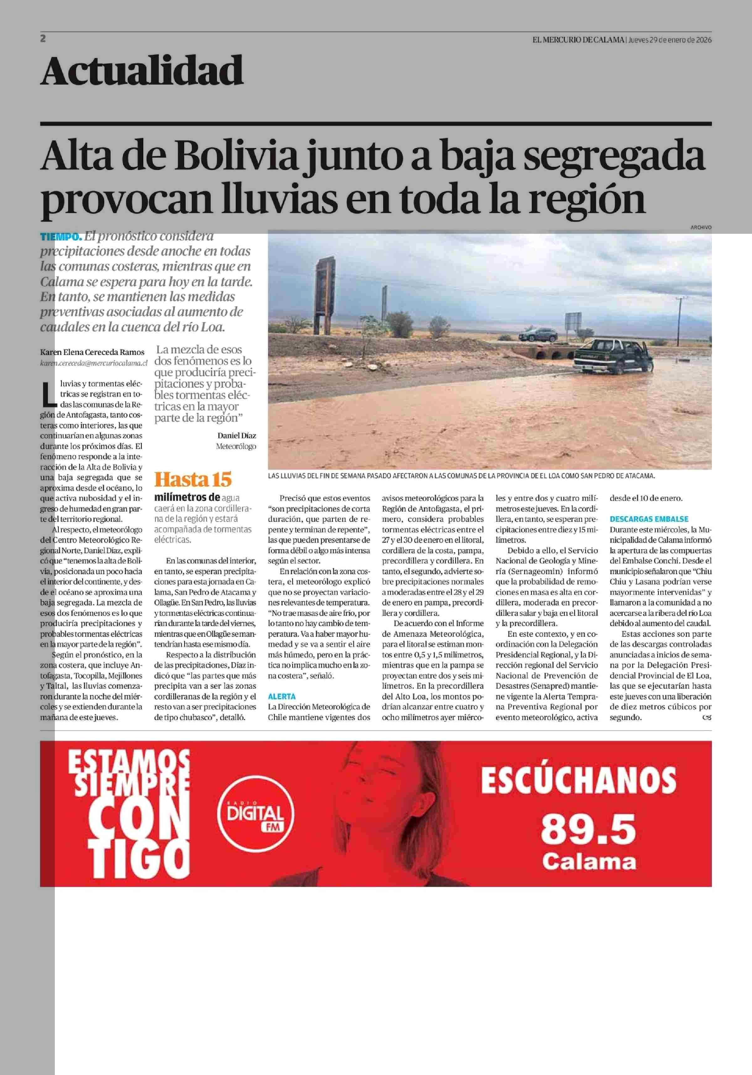 Alta de Bolivia junto a baja segregada provocan lluvias en toda la región 29-01-2026 El Mercurio de Calama |