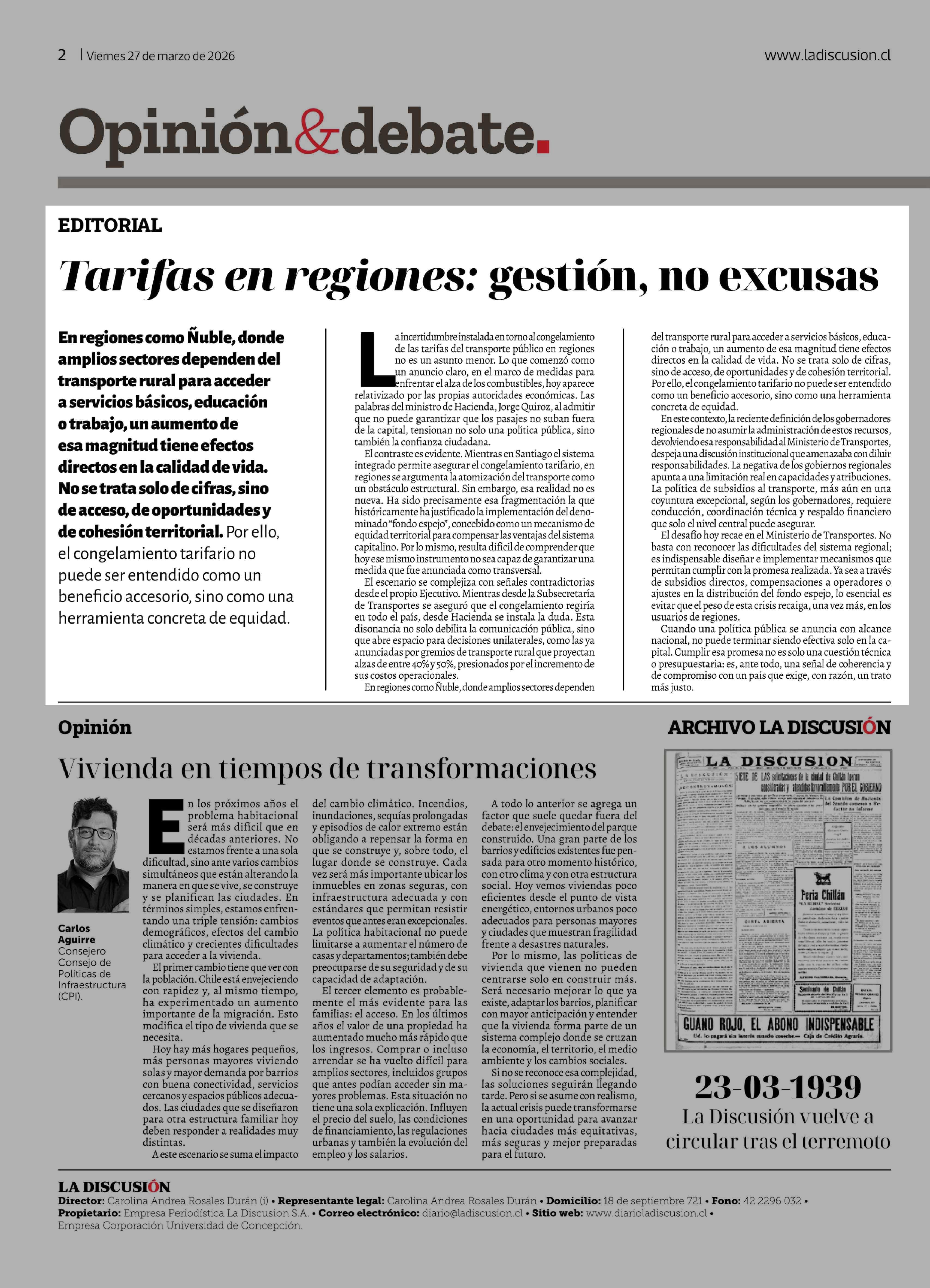 Editorial: Tarifas en regiones: gestión, no excusas 27-03-2026 La Discusión |