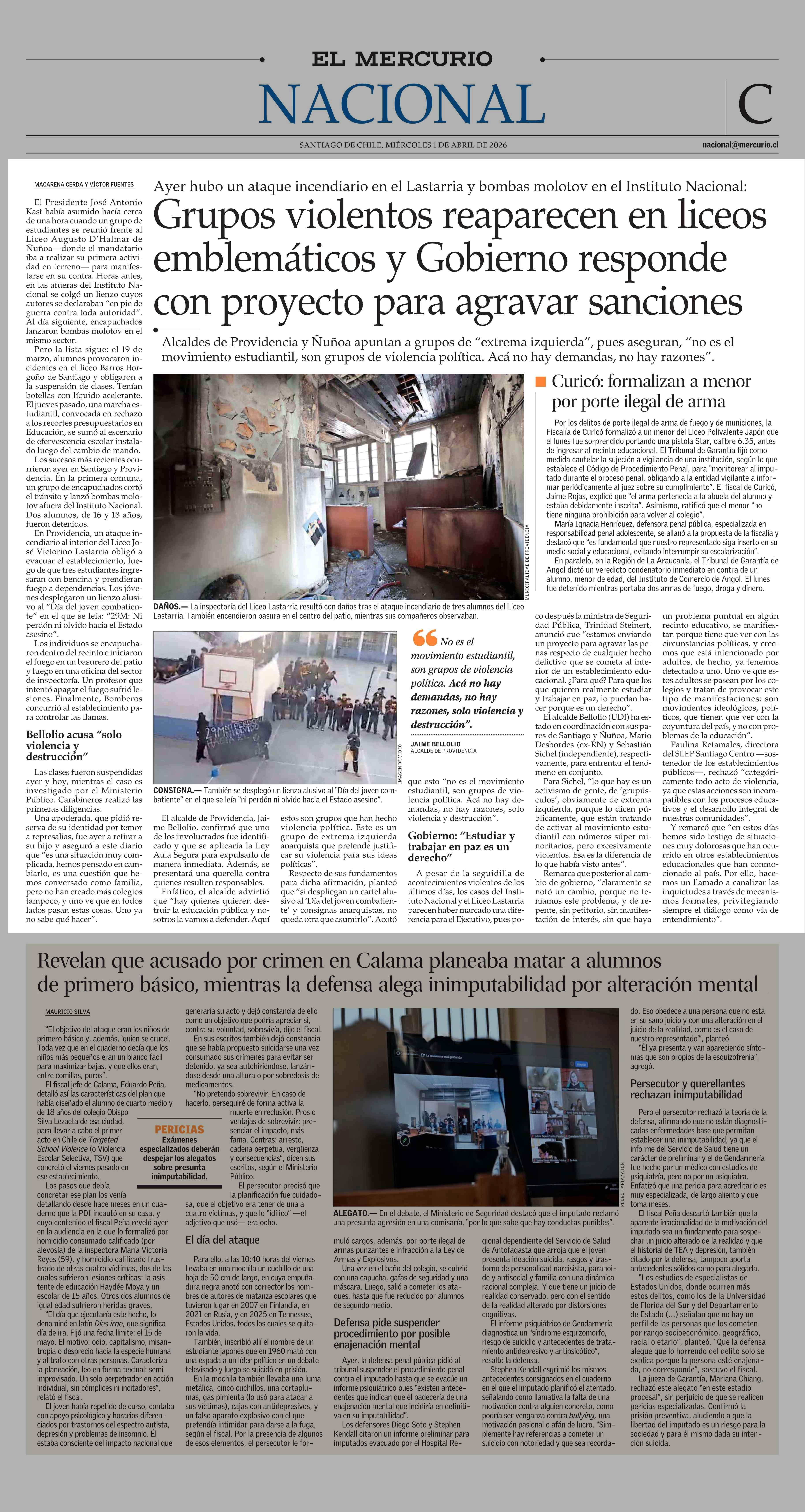 Grupos violentos reaparecen en liceos emblemáticos y Gobierno responde con proyecto para agravar sanciones 01-04-2026 El Mercurio |