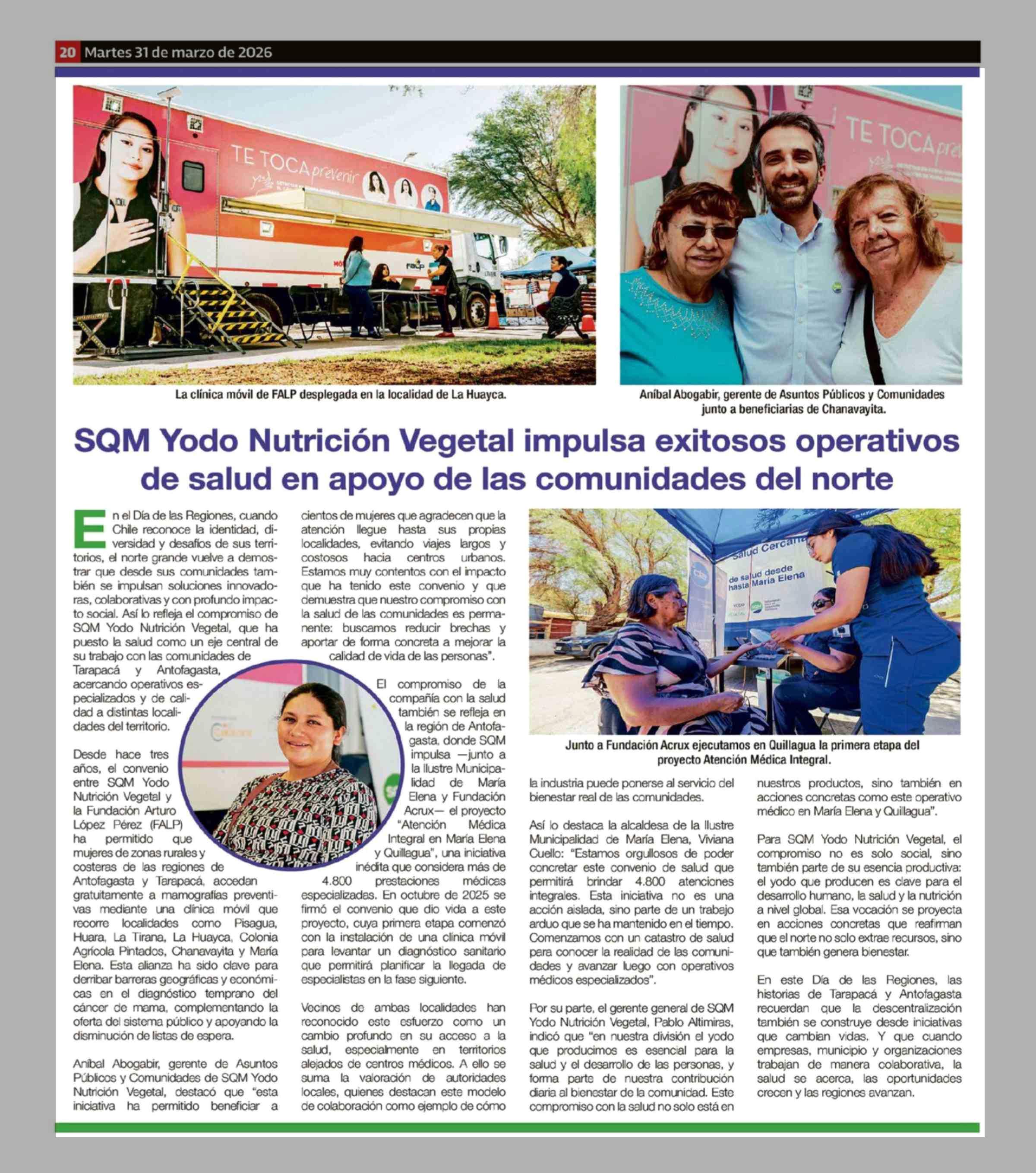 Título: SQM Yodo Nutrición Vegetal impulsa exitosos operativos de salud en apoyo de las comunidades del norte