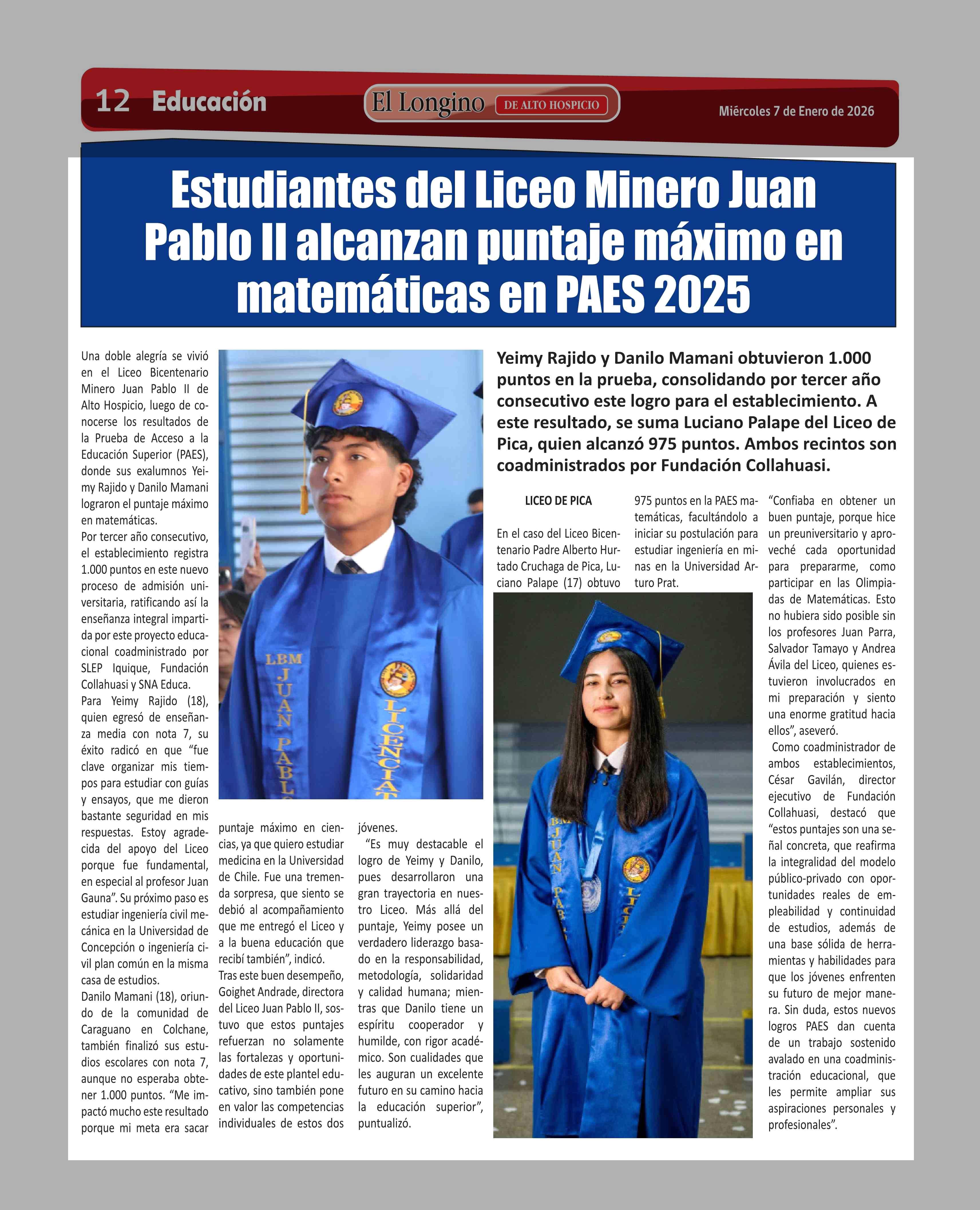 Estudiantes del Liceo Minero Juan Pablo II alcanzan puntaje máximo en matemáticas en PAES 2025 07-01-2026 El Longino |