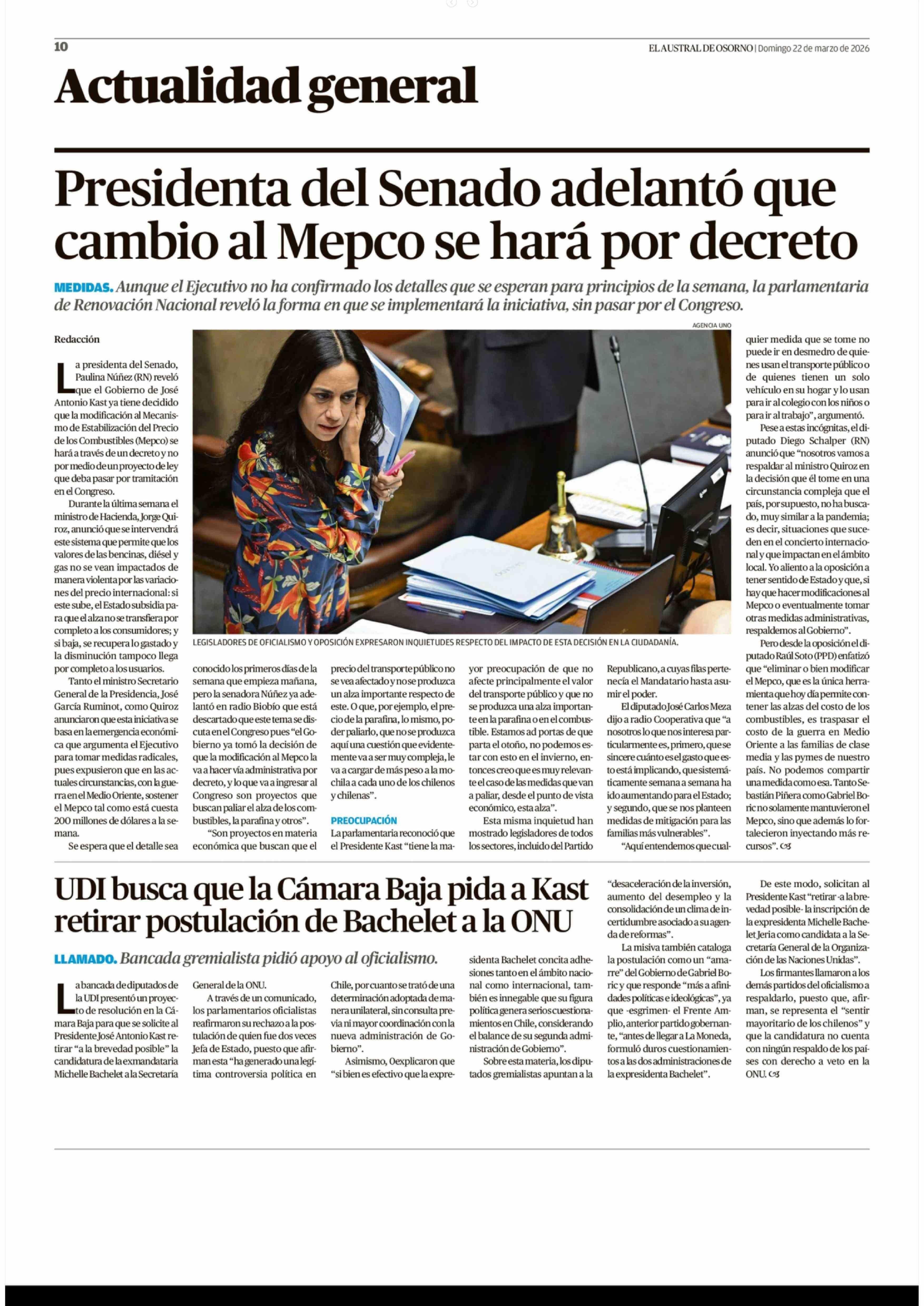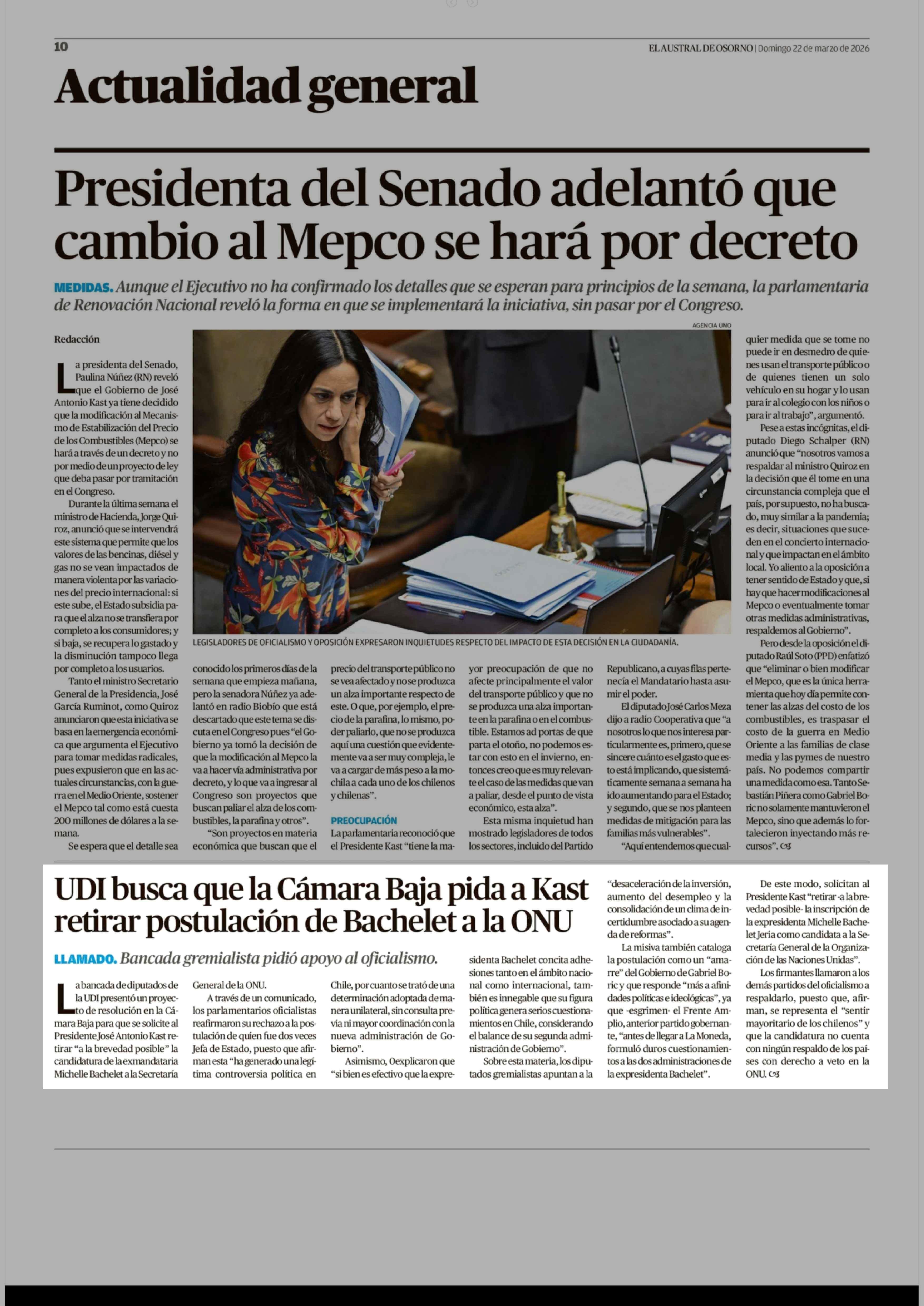 UDI busca que la Cámara Baja pida a Kast retirar postulación de Bachelet a la ONU 22-03-2026 El Austral de Osorno |