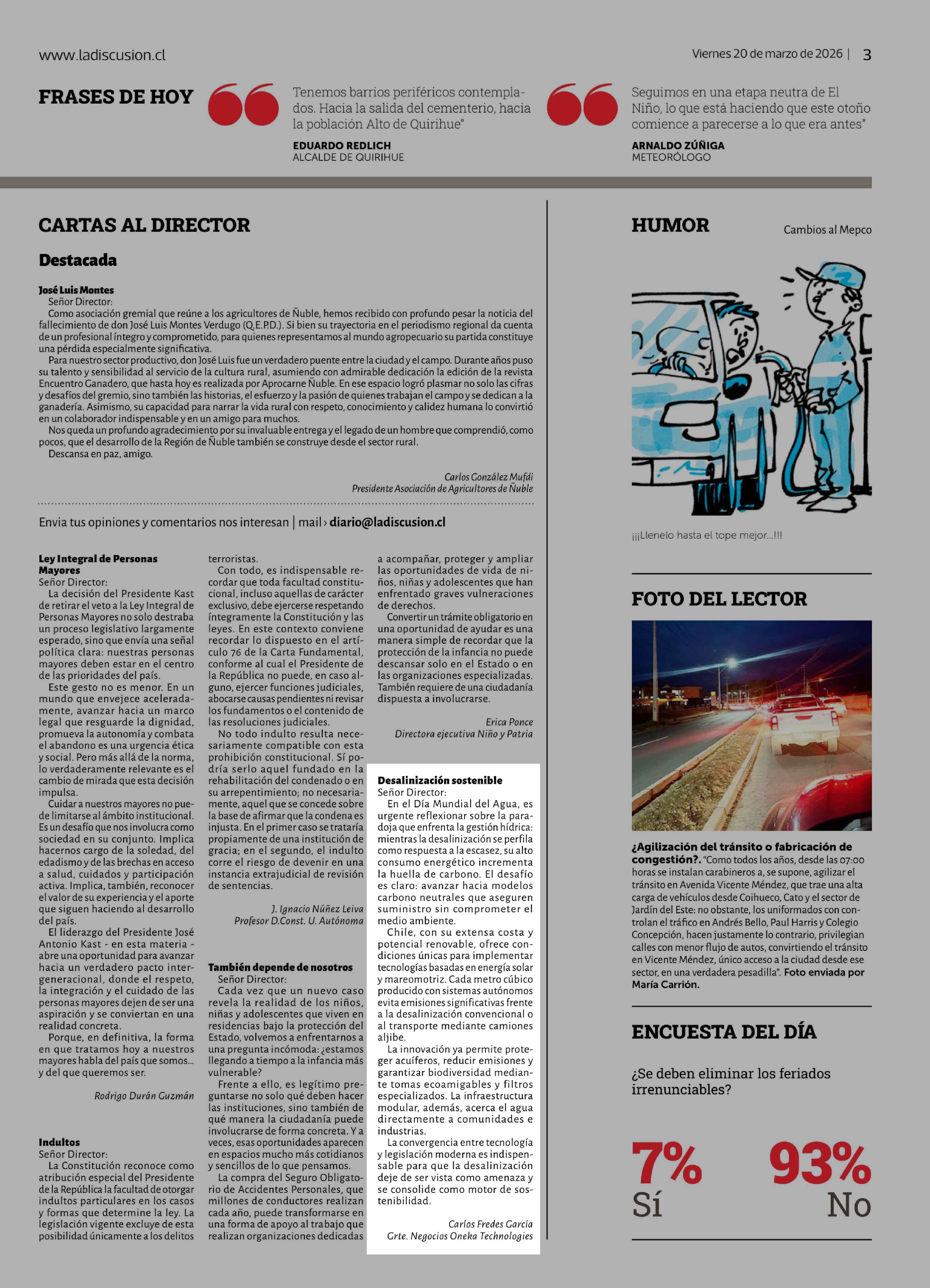| Título: | Cartas: Desalinización sostenible Señor Director: En el Día Mundial del Agua, es urgente reflexionar sobre la paradoja que enfrenta la gestión hídrica: mientras la desalinización se perfila como respuesta a la escasez, su alto consumo energético incrementa la huella de carbono. El desafío es claro: |