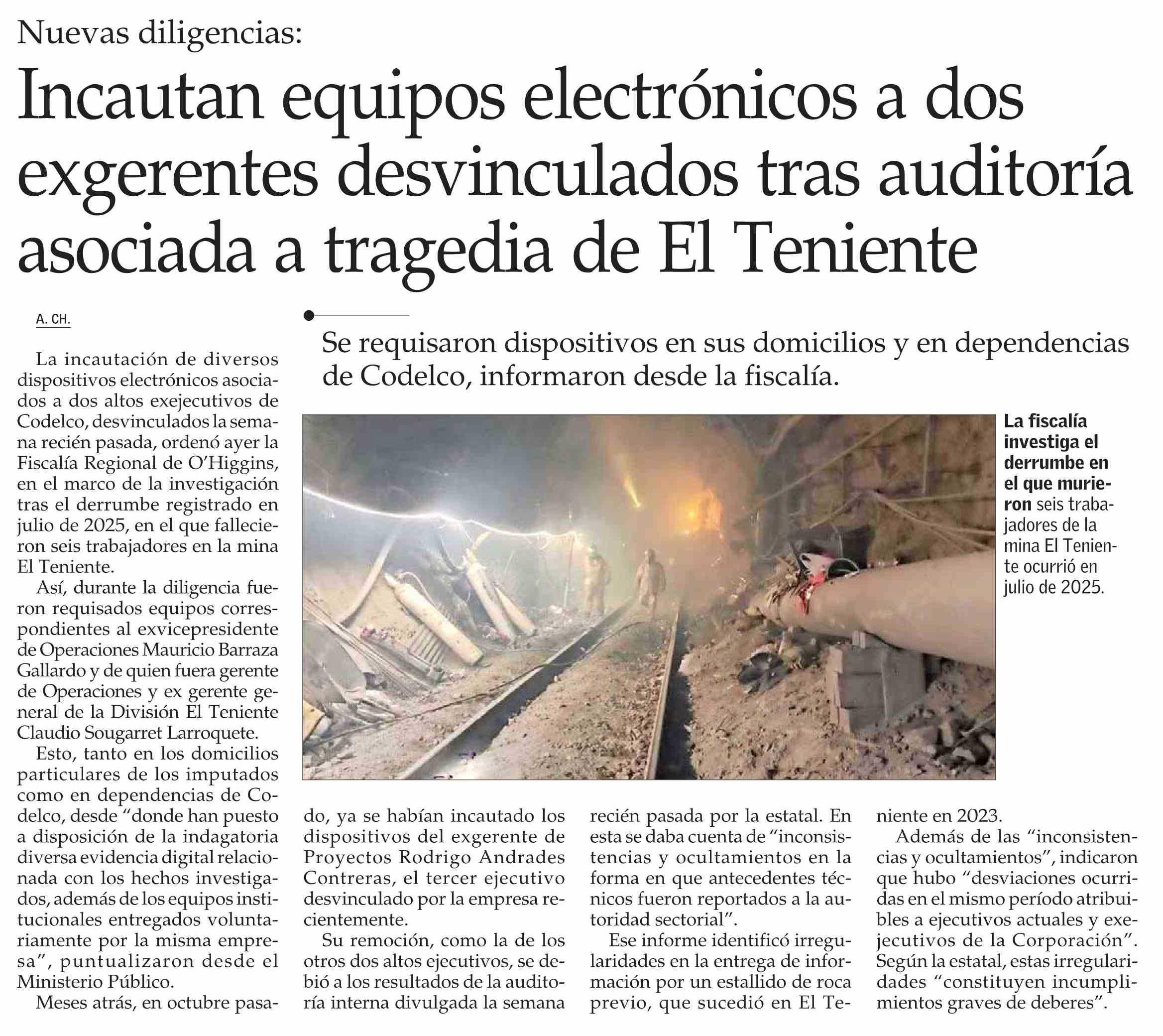 Título: Incautan equipos electrónicos a dos exgerentes desvinculados tras auditoría asociada a tragedia de El Teniente