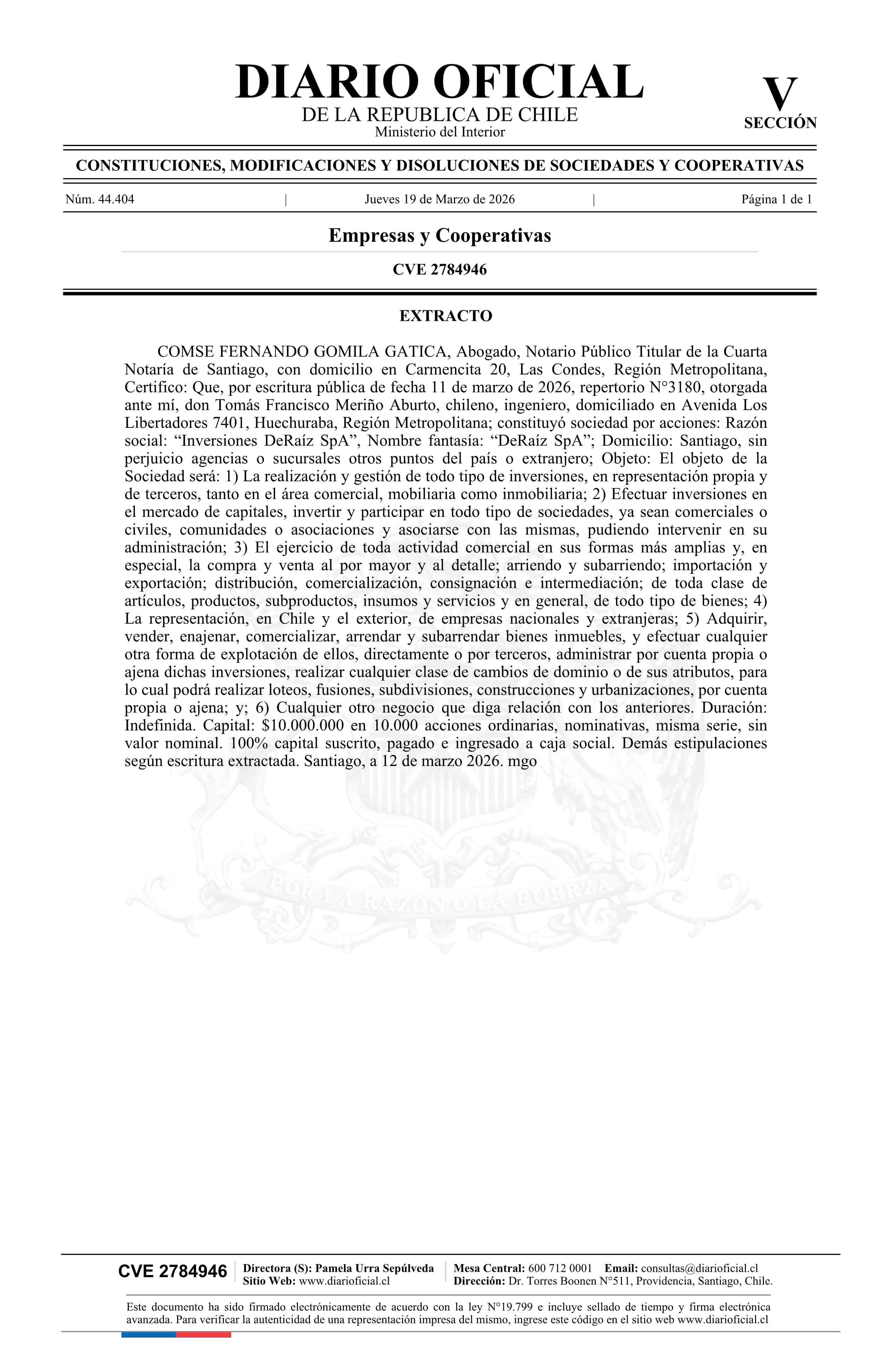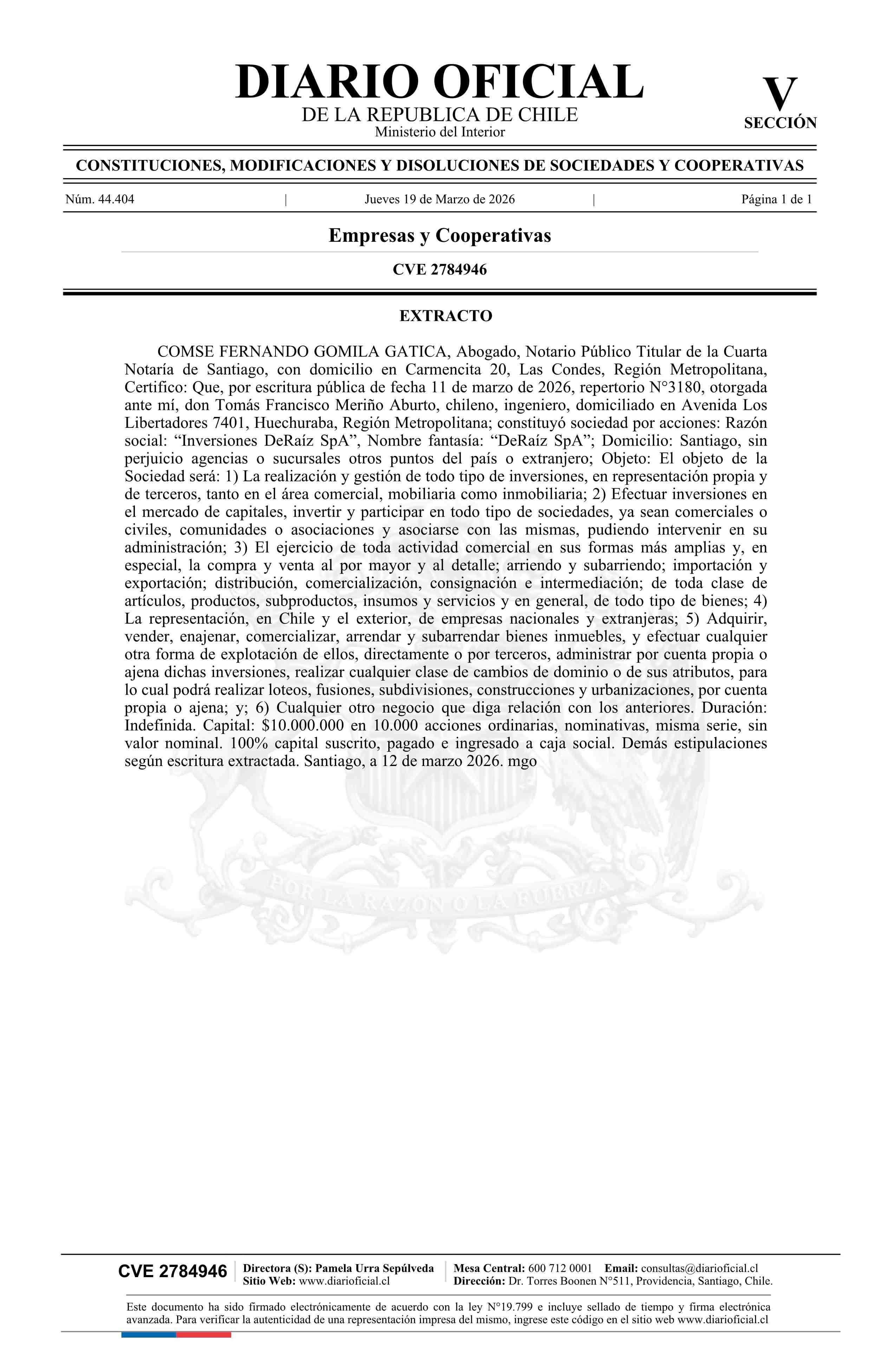 Título: Inversiones DeRaíz SpA