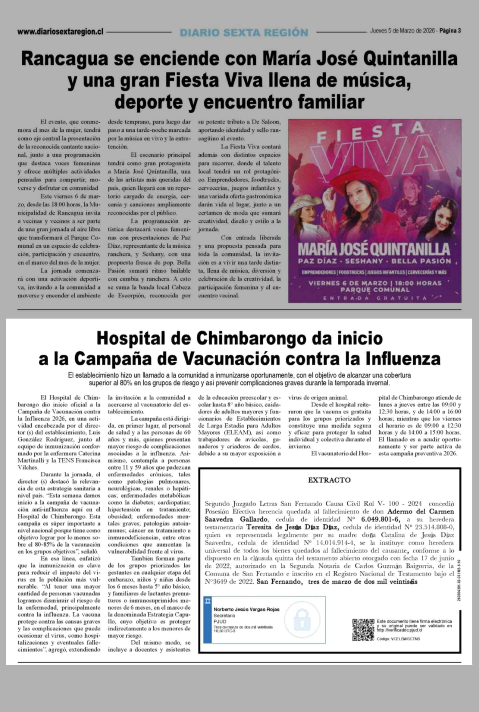 Fecha: 05-03-2026 Sector: Noticia general Región: Región del Libertador General Bernardo O'Higgins