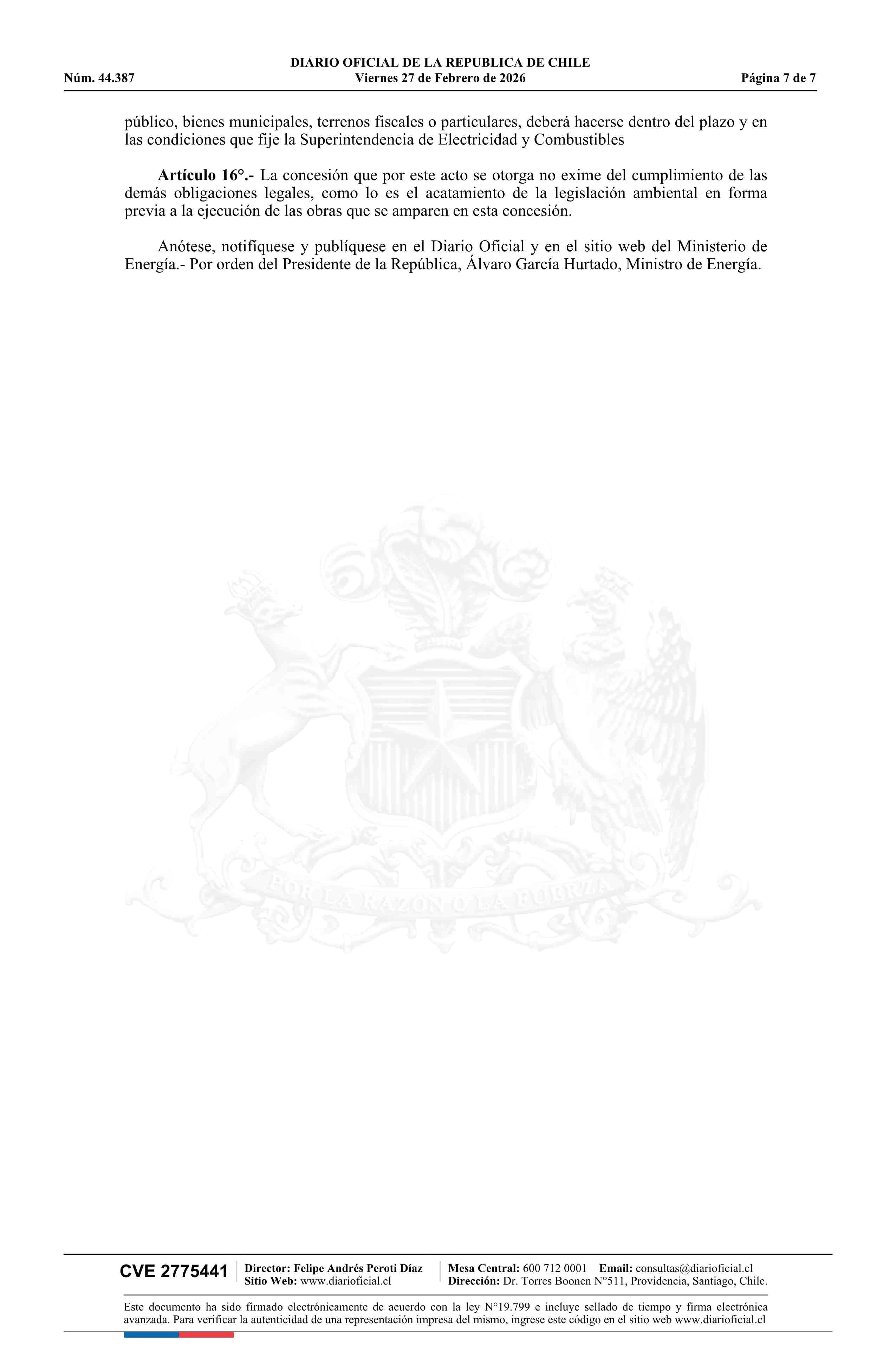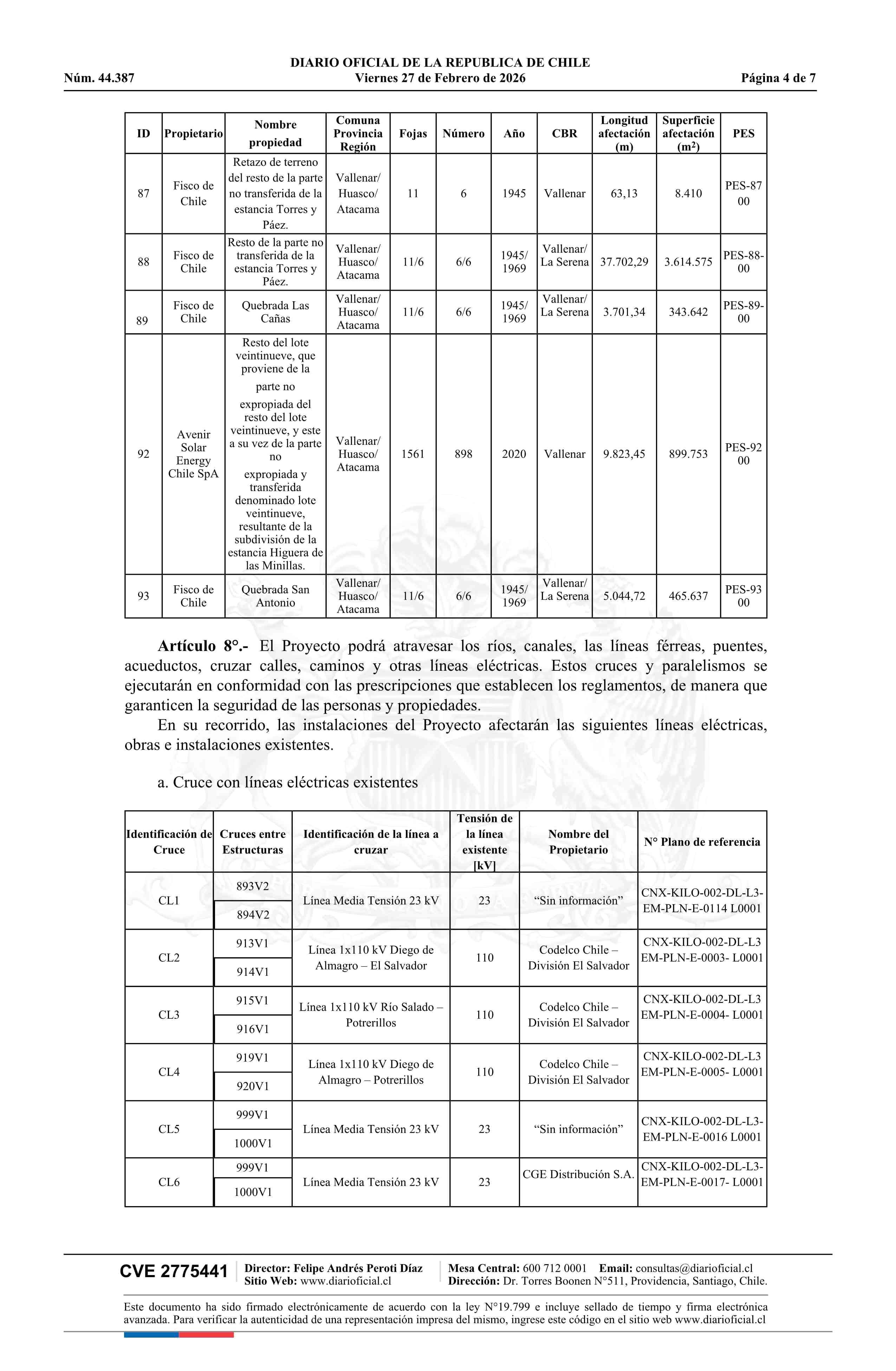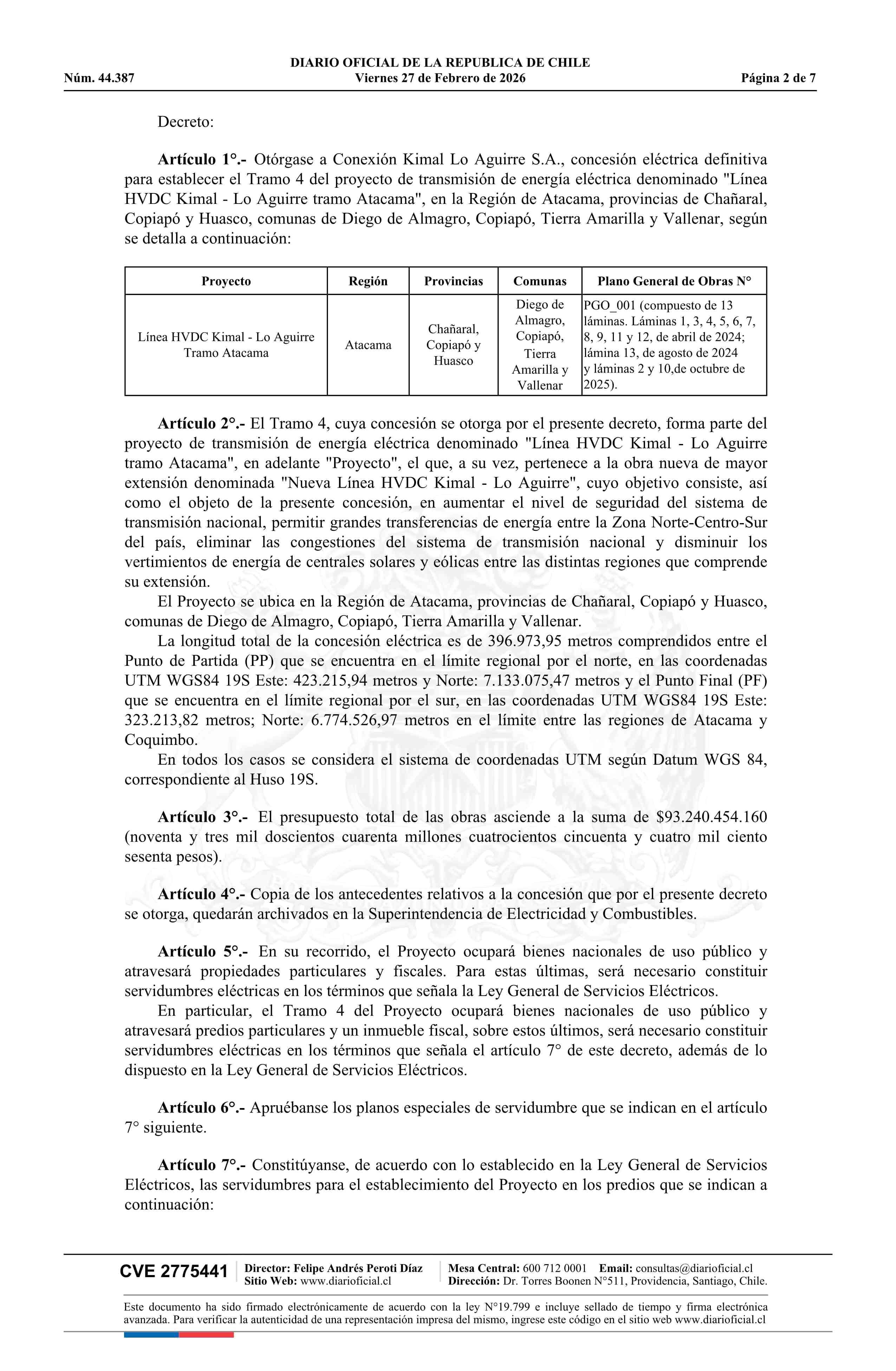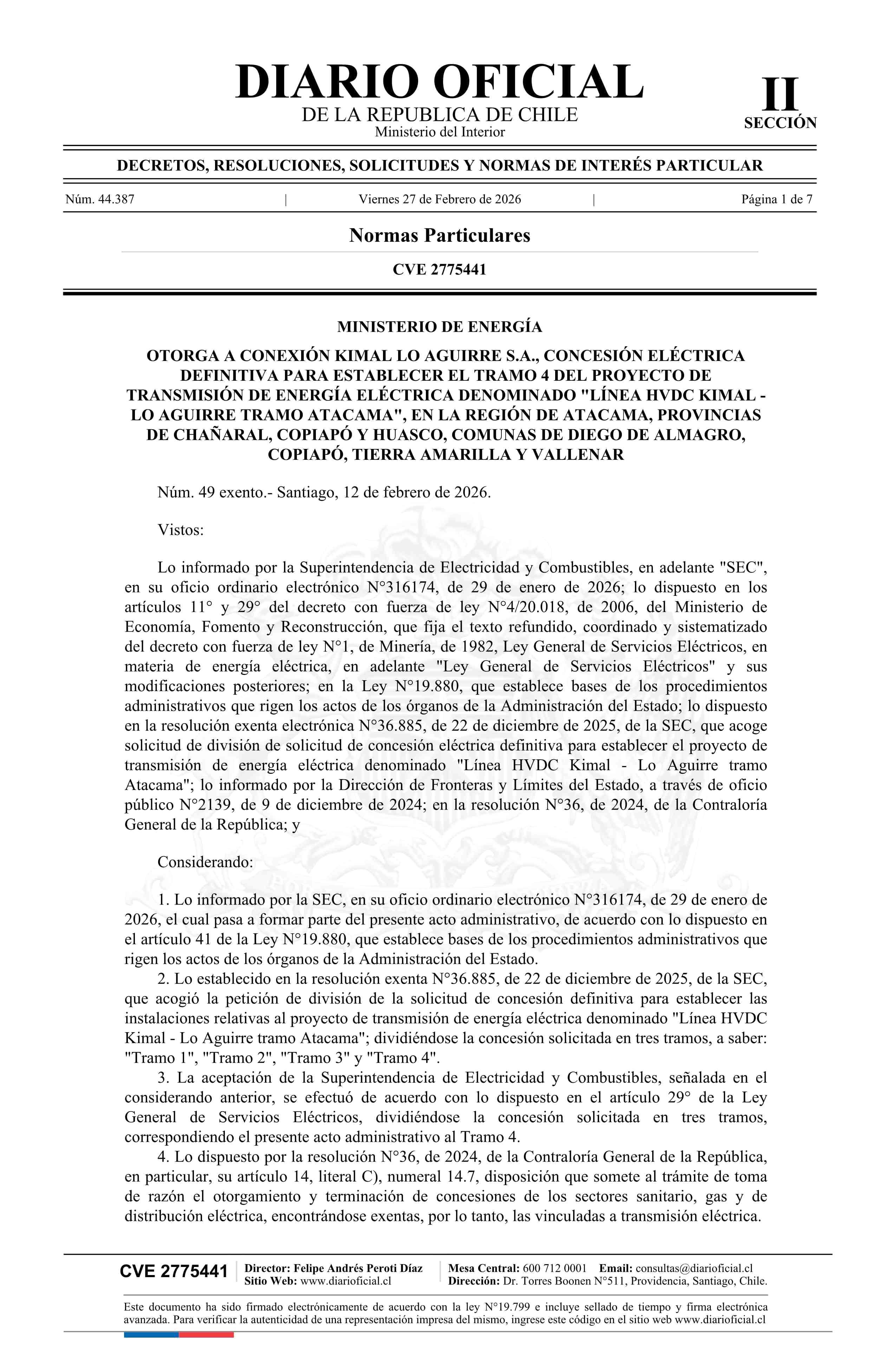 | Título: | Decreto exento número 49, de 2026.- Otorga a Conexión Kimal Lo Aguirre S.A., concesión eléctrica definitiva para establecer el tramo 4 del proyecto de transmisión de energía eléctrica denominado Línea HVDC Kimal - Lo Aguirre Tramo Atacama, en la Región de Atacama, provincias de Chañaral, Copiapó y H |