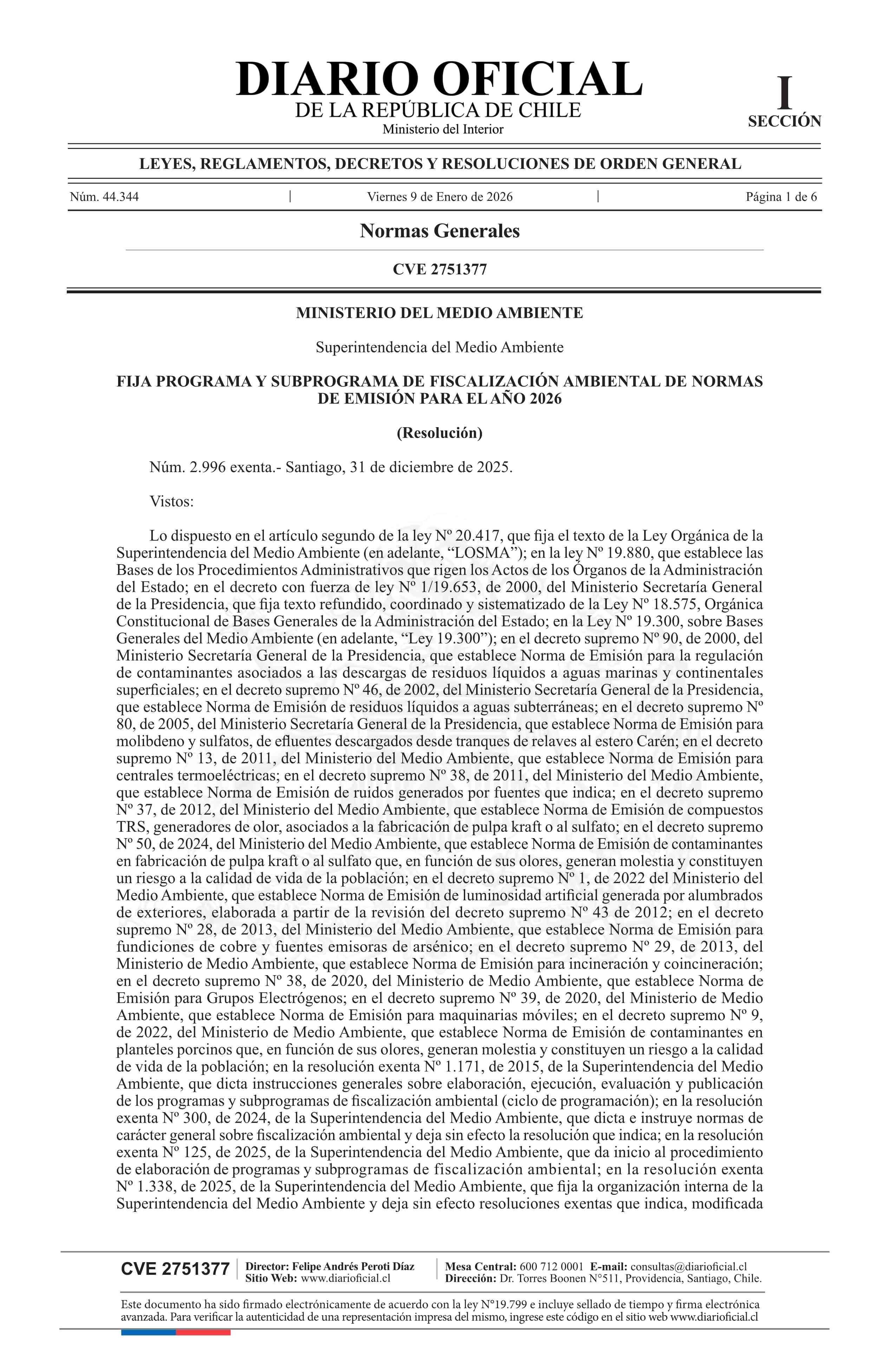 AVISO LICITACIONES: Resolución exenta número 2.996, de 2025.- Fija programa y subprograma de fiscalización ambiental de normas de emisión para el año 2026 09-01-2026 Diario Oficial Edición Electrónica |