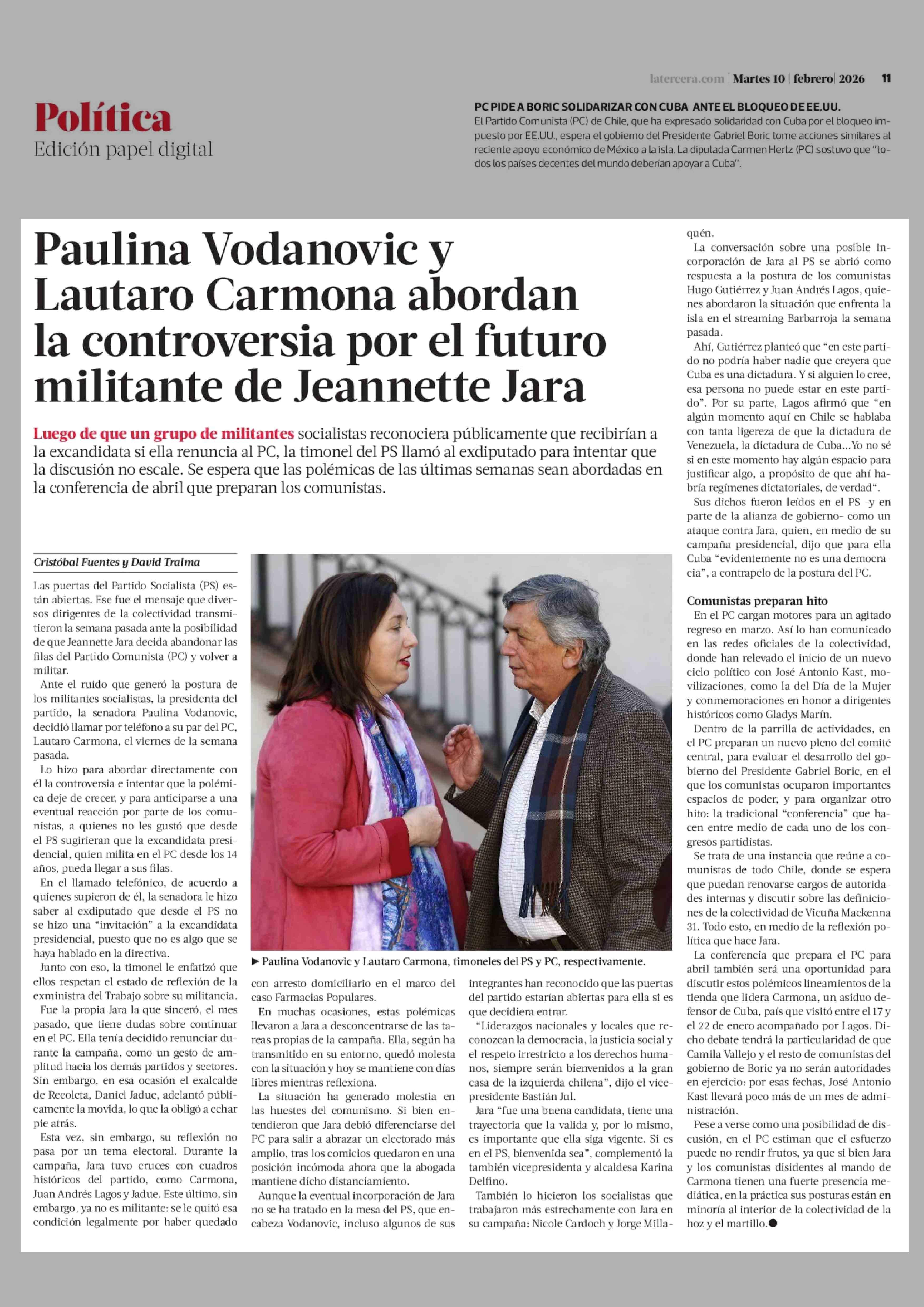 Paulina Vodanovic y Lautaro Carmona abordan la controversia por el futuro militante de Jeannette Jara 10-02-2026 La Tercera |