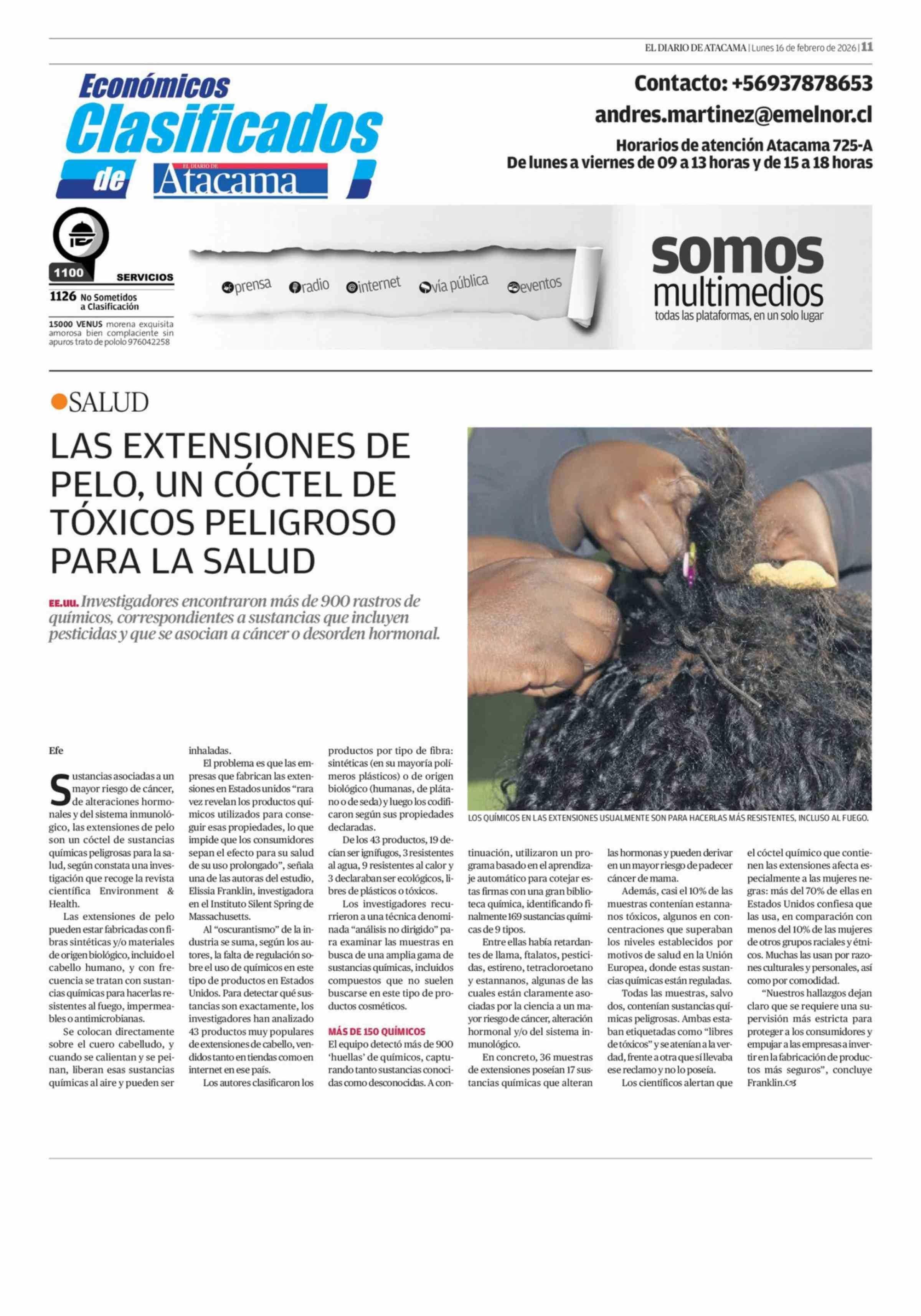 LAS EXTENSIONES DE PELO, UN CÓCTEL DE TÓXICOS PELIGROSO PARA LA SALUD 16-02-2026 El Diario de Atacama |