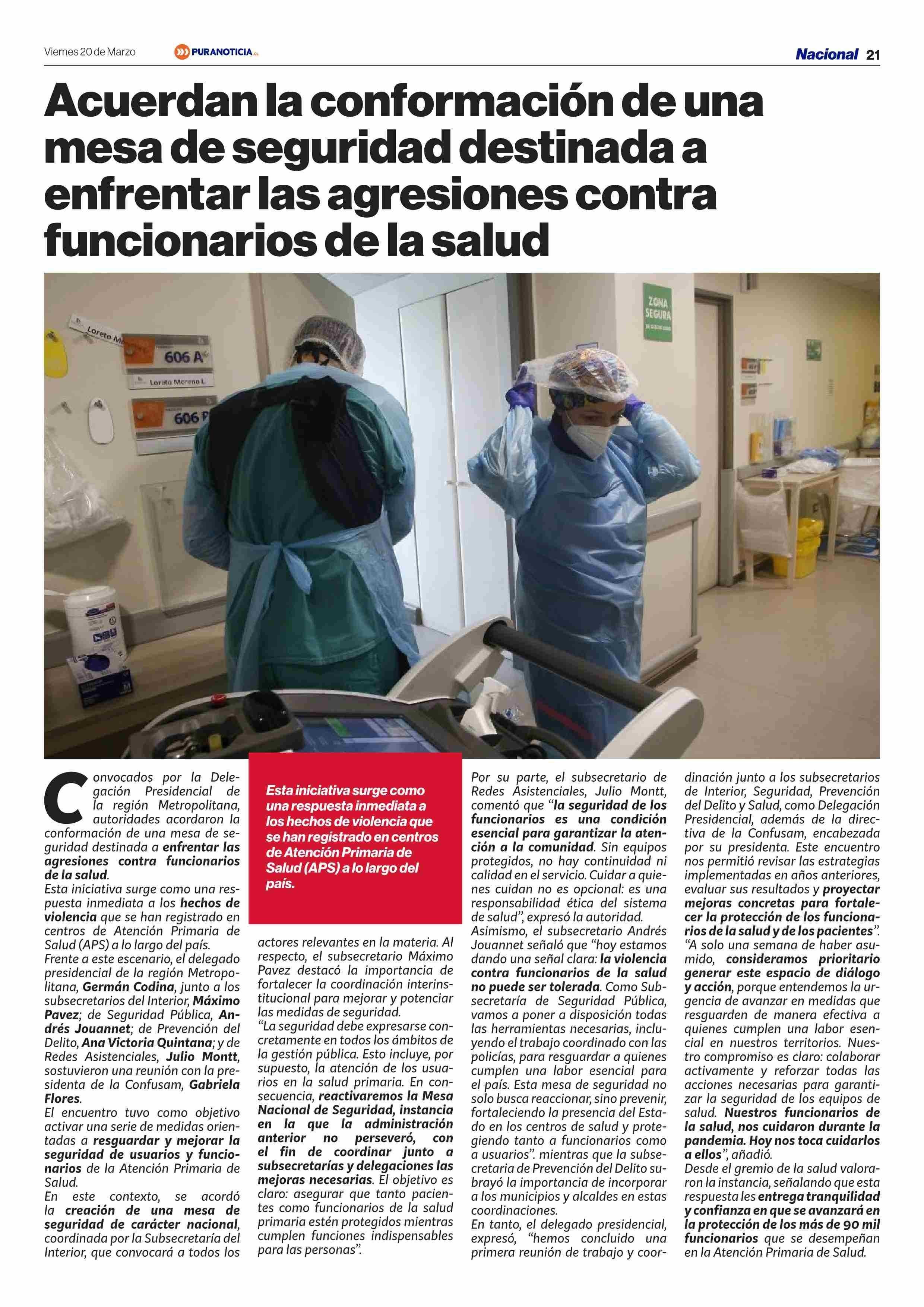 Acuerdan la conformación de una mesa de seguridad destinada a enfrentar las agresiones contra funcionarios de la salud 20-03-2026 Puranoticia.cl |