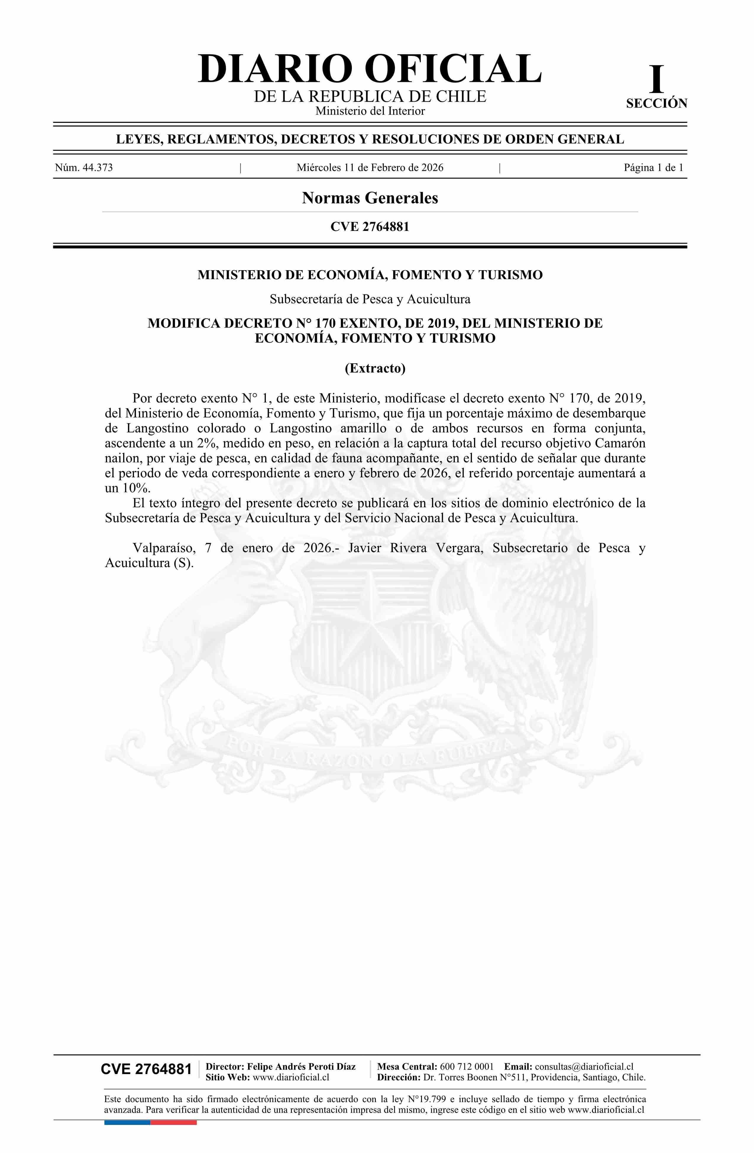 | Título: | Extracto de decreto exento número 1, de 2026.- Modifica decreto N° 170 exento, de 2019 |