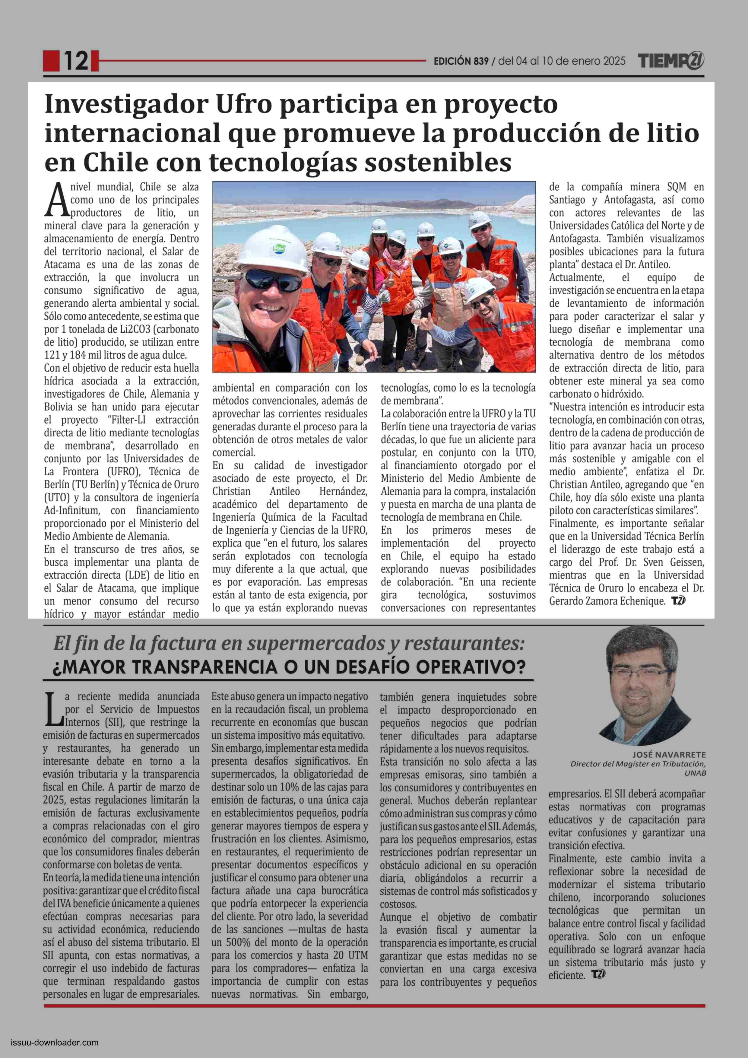 Investigador Ufro participa en proyecto internacional que promueve la producción de litio en Chile con tecnologías sostenibles 04-01-2025 Tiempo 21 |