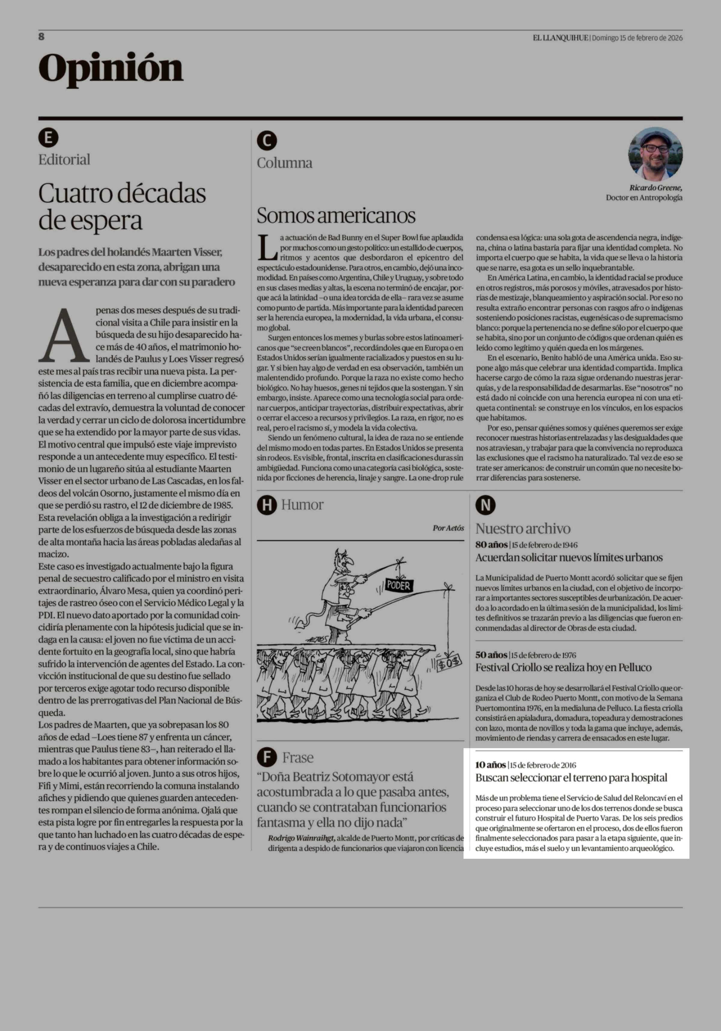 10 Años |15 de febrero de 2016 Buscan seleccionar el terreno para hospital 15-02-2026 El Llanquihue |