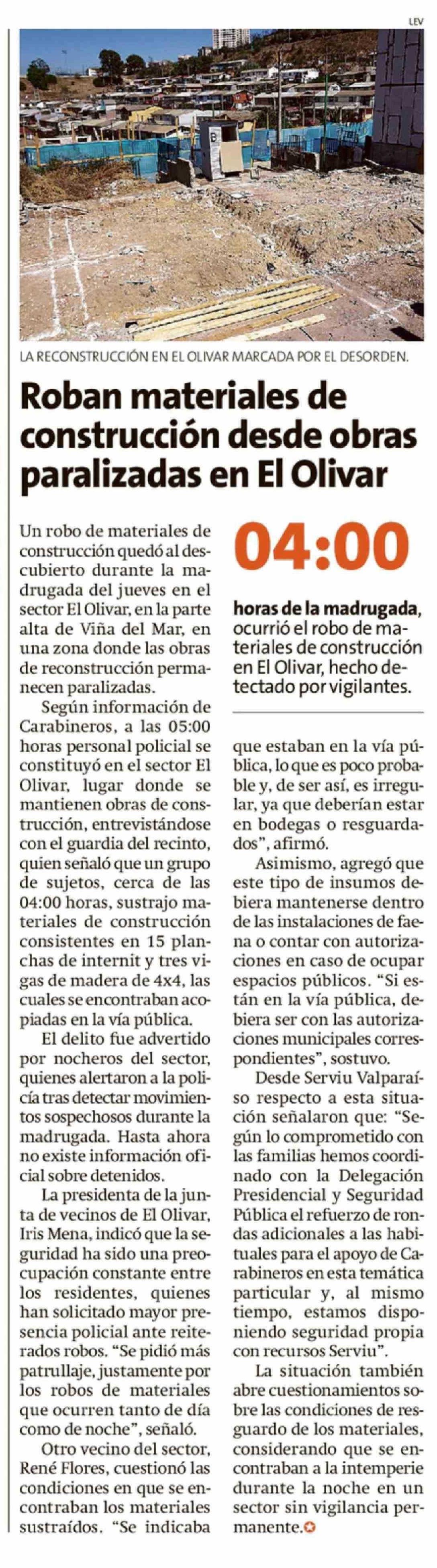Título: Roban materiales de construcción desde obras paralizadas en El Olivar