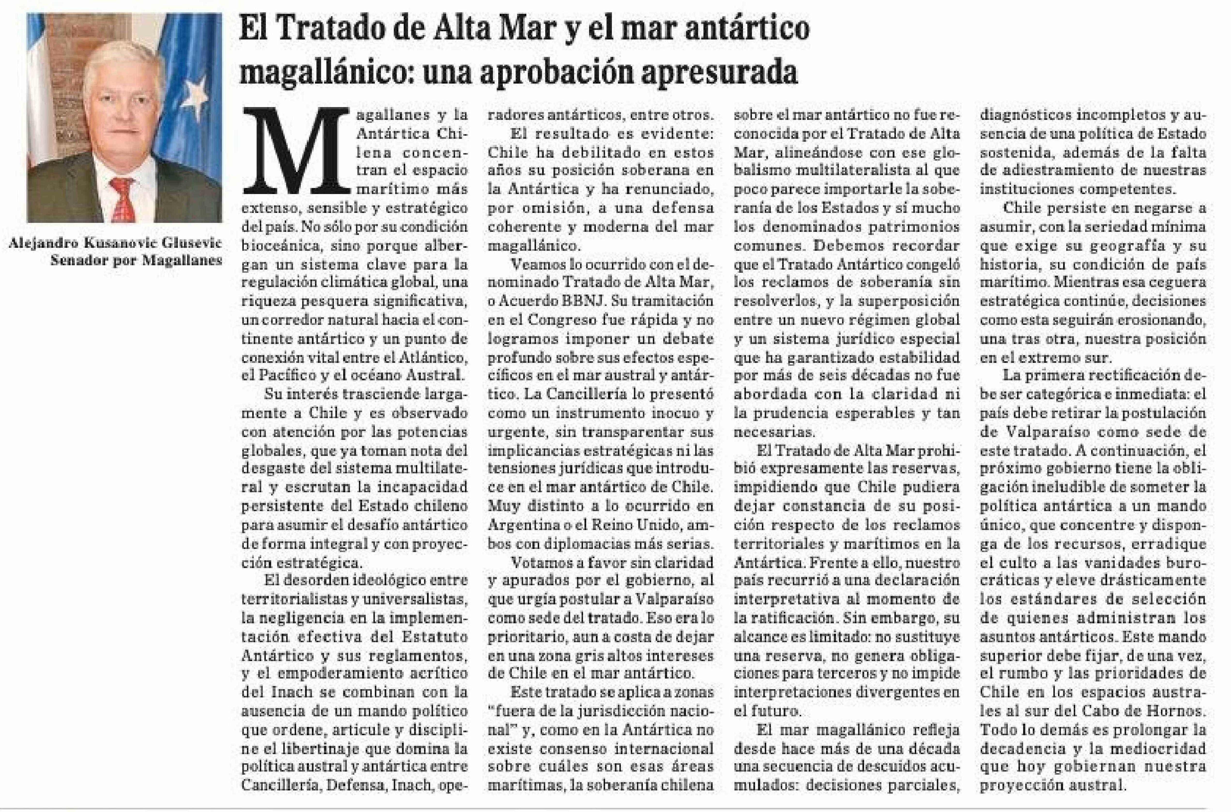 Título: Columnas de Opinión: El Tratado de Alta Mar y el mar antártico magallánico: una aprobación apresurada
