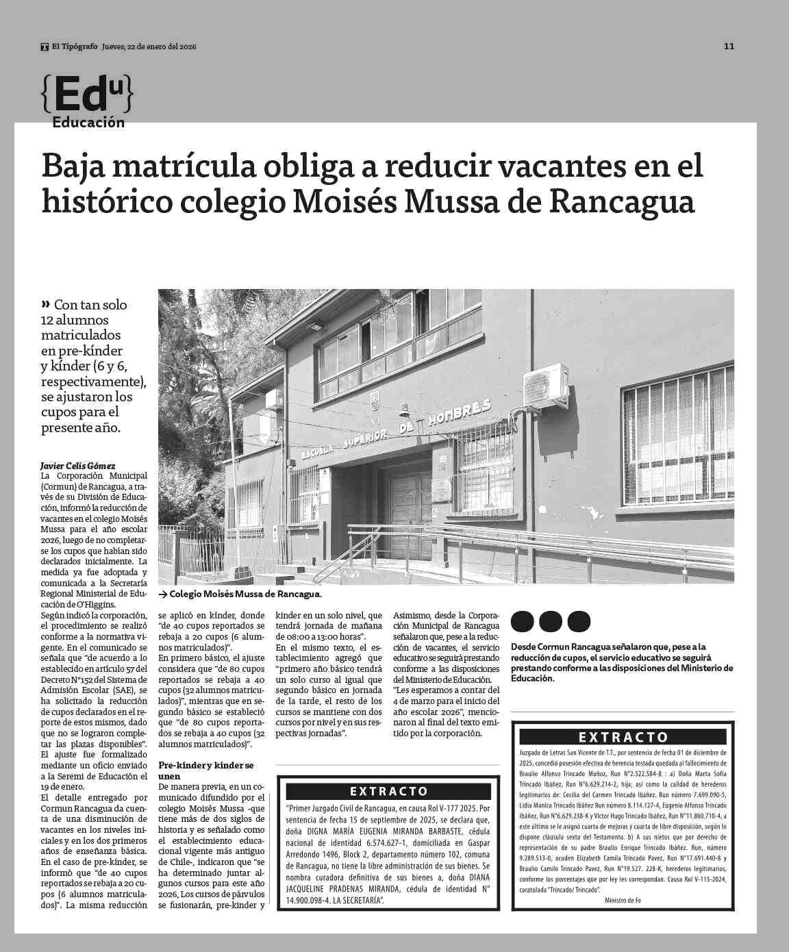 Baja matrícula obliga a reducir vacantes en el histórico colegio Moisés Mussa de Rancagua 22-01-2026 El Tipógrafo |