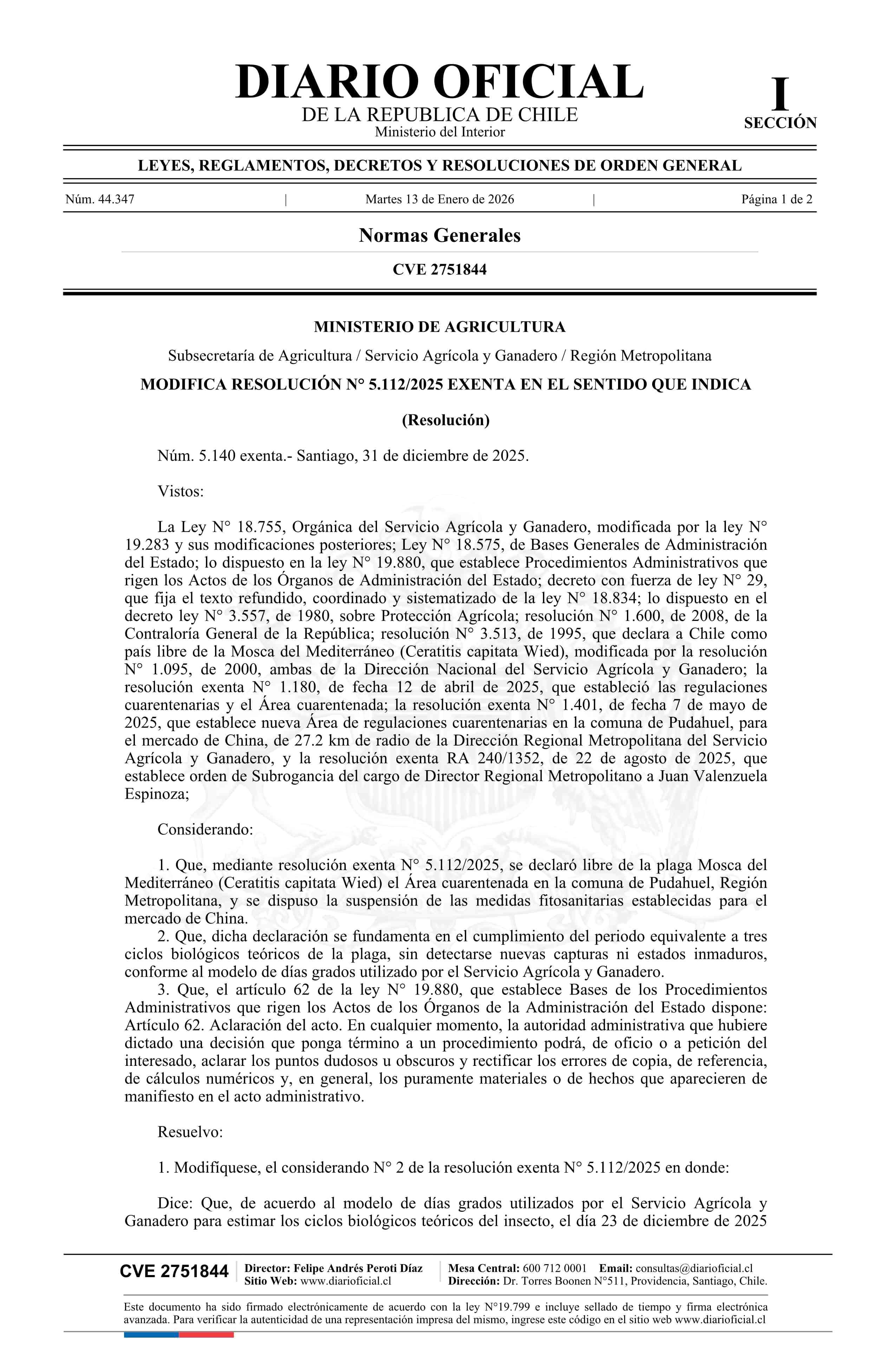 Resolución exenta número 5.140, de 2025.- Modifica resolución N° 5.112 exenta, de 2025 13-01-2026 Diario Oficial Edición Electrónica |