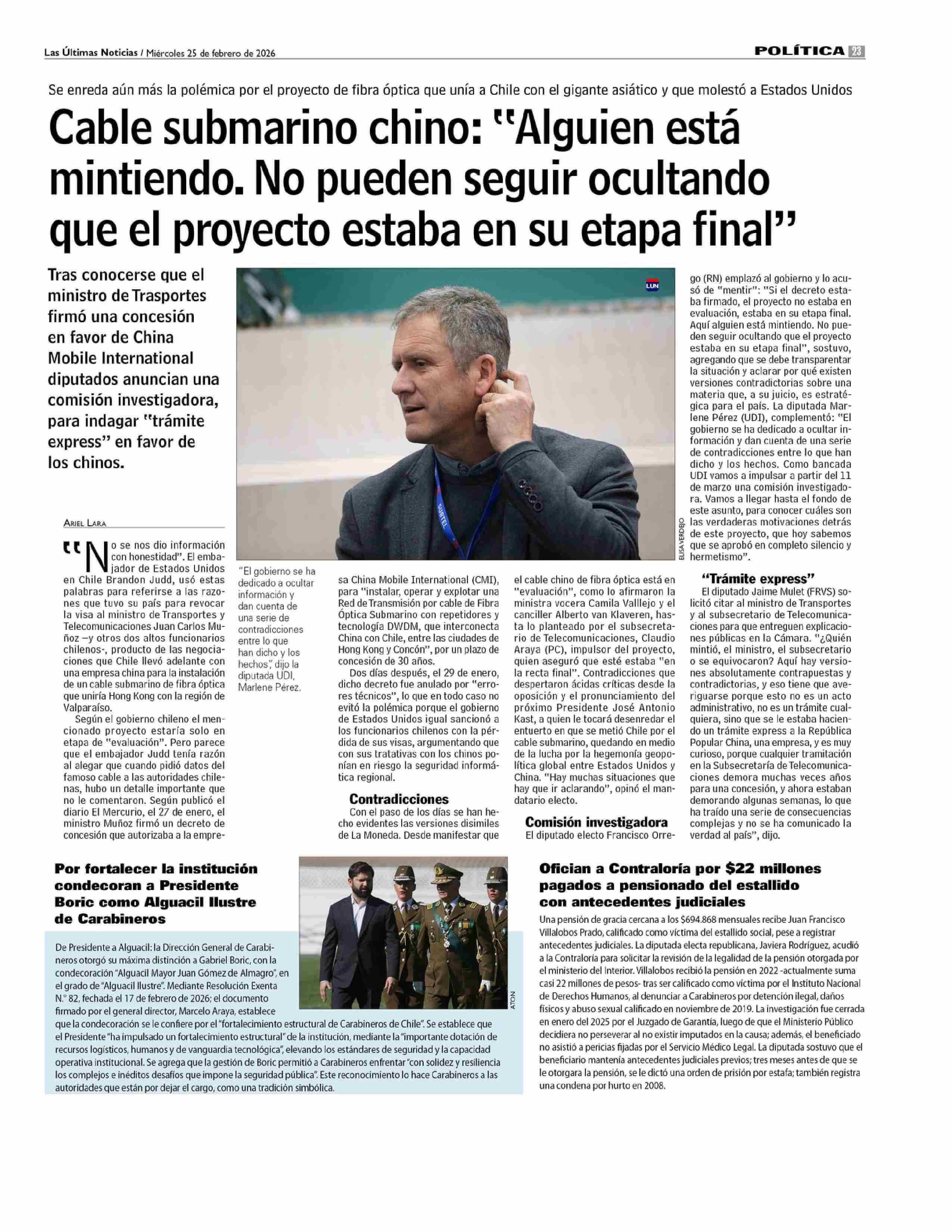Cable submarino chino: "Alguien está mintiendo. No pueden seguir ocultando que el proyecto estaba en su etapa final" 25-02-2026 Las Últimas Noticias |
