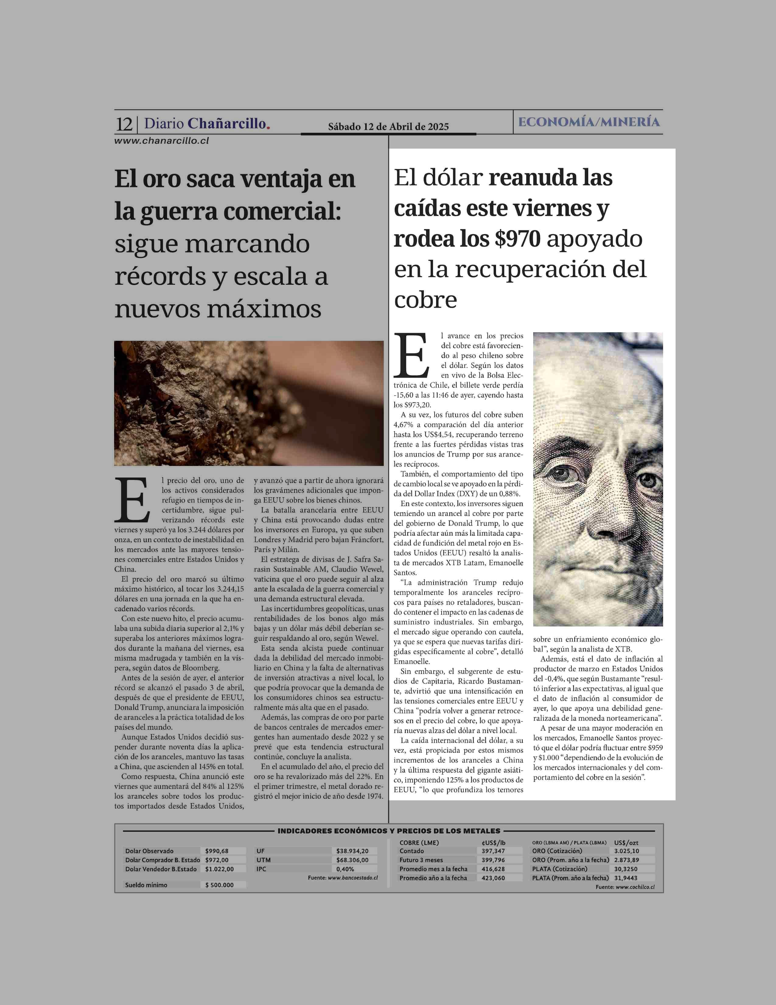 El dólar reanuda las caídas este viernes y rodea los $970 apoyado en la recuperación del cobre 12-04-2025 Diario Chañarcillo |