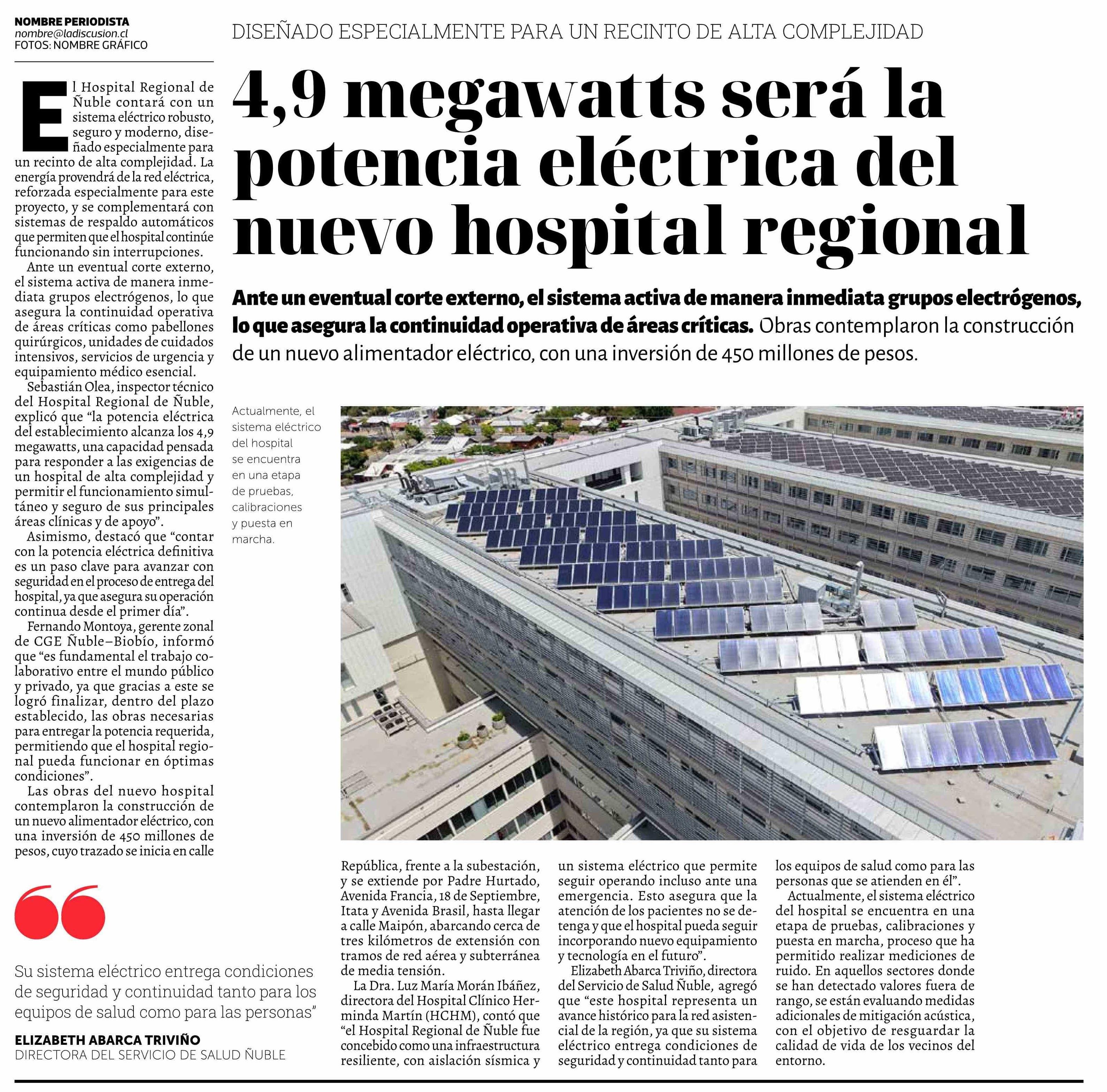 4,9 Megawatts será la potencia eléctrica del nuevo hospital regional 07-02-2026 La Discusión |
