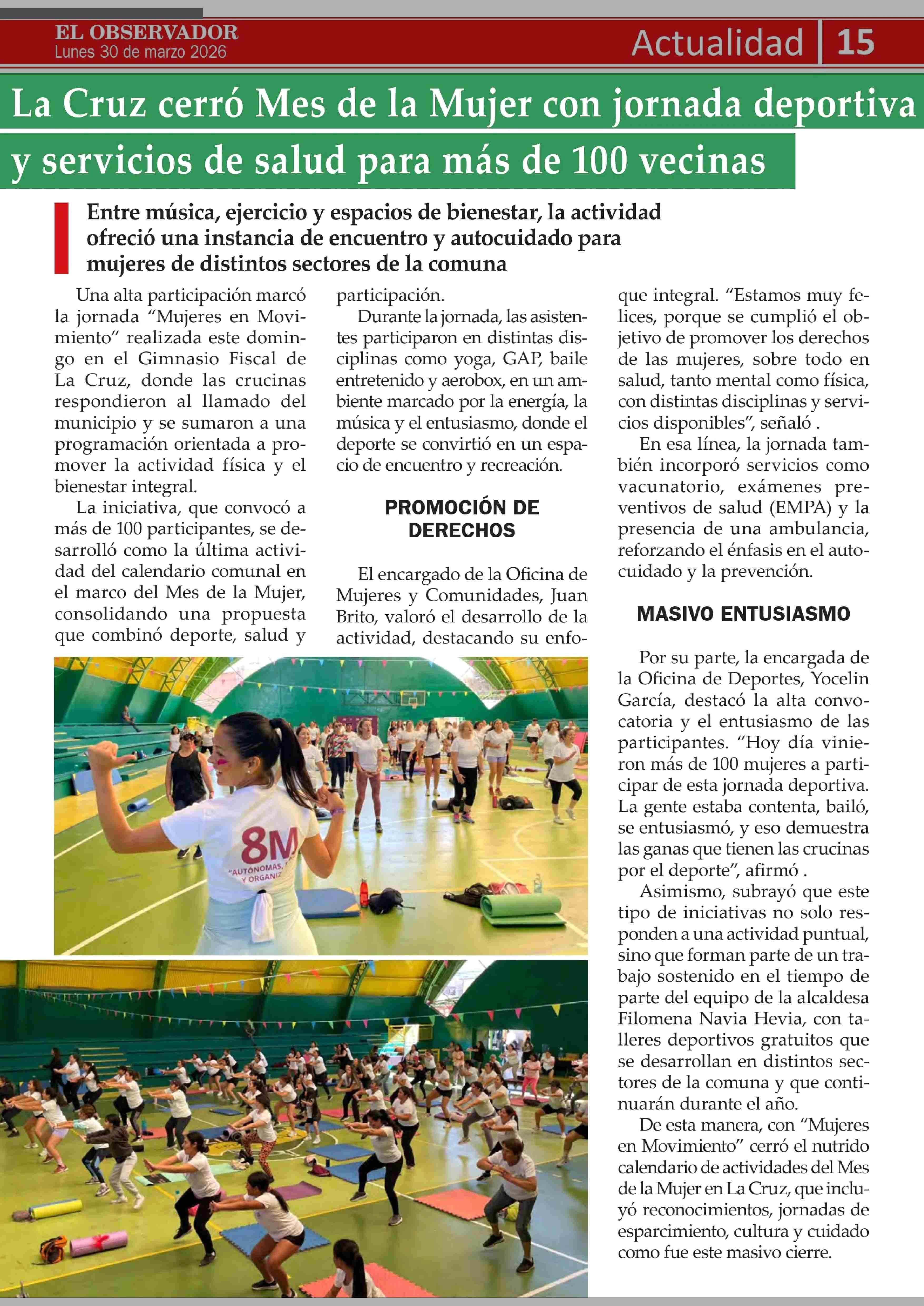 La Cruz cerró Mes de la Mujer con jornada deportiva y servicios de salud para más de 100 vecinas 30-03-2026 El Observador Vespertino |