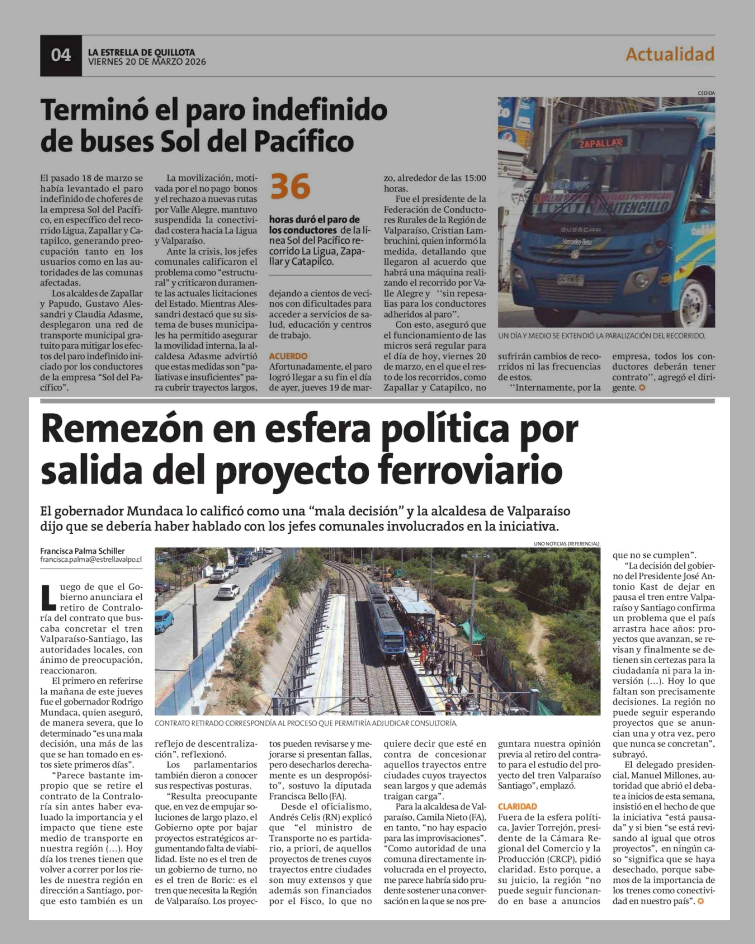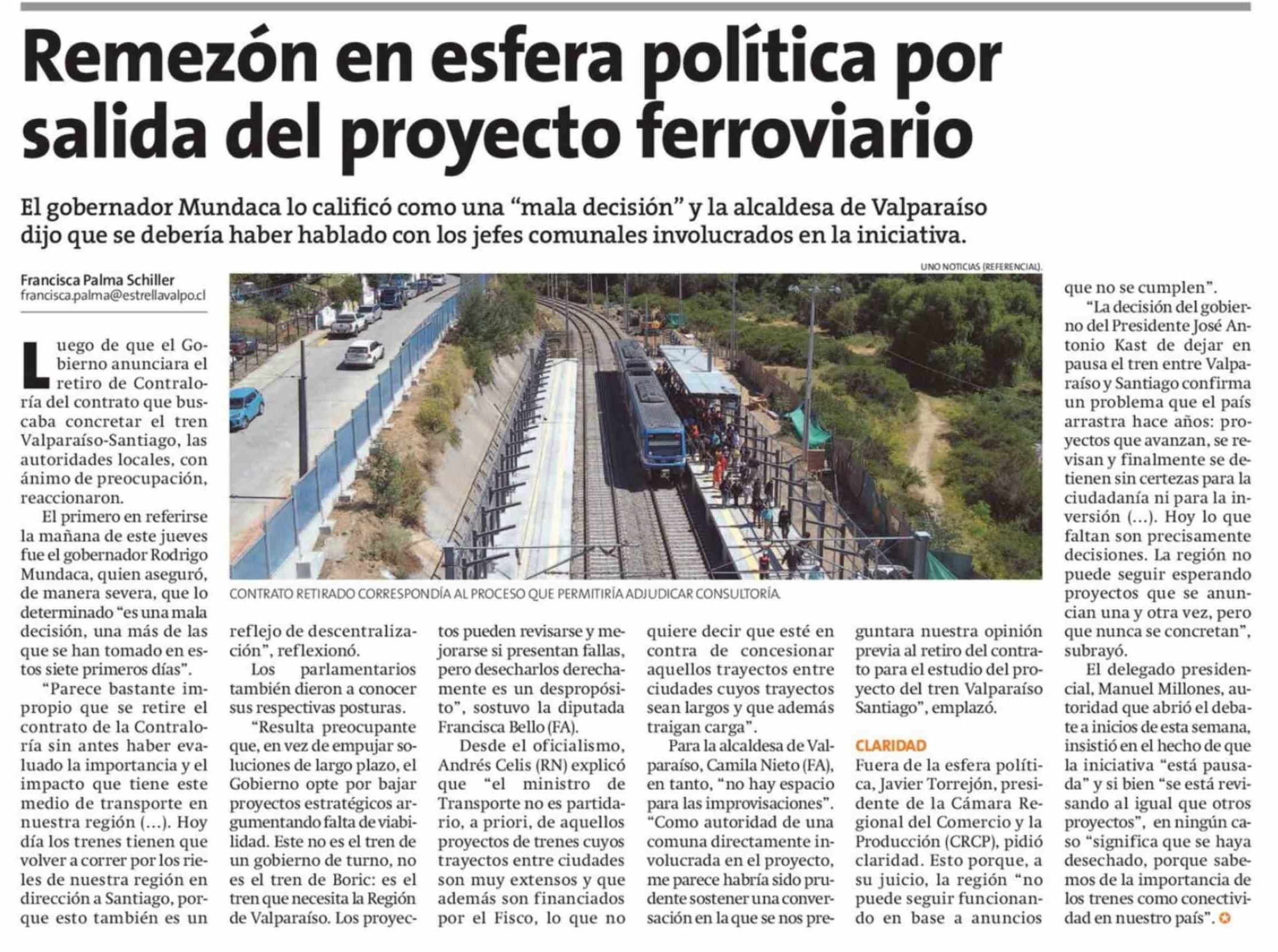 Remezón en esfera política por salida del proyecto ferroviario 20-03-2026 La Estrella de Quillota |