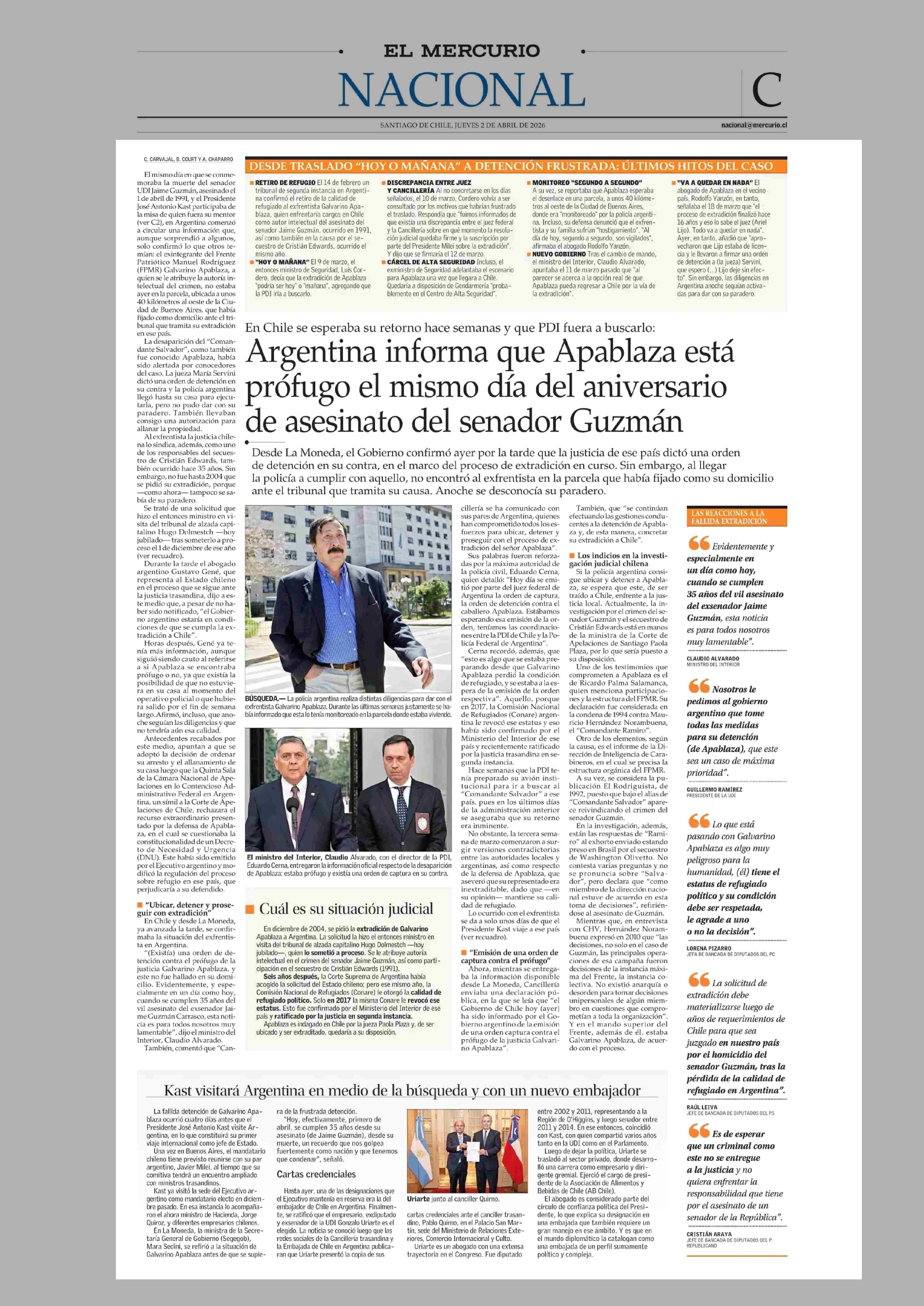 Título: Argentina informa que Apablaza está prófugo el mismo día del aniversario de asesinato del senador Guzmán